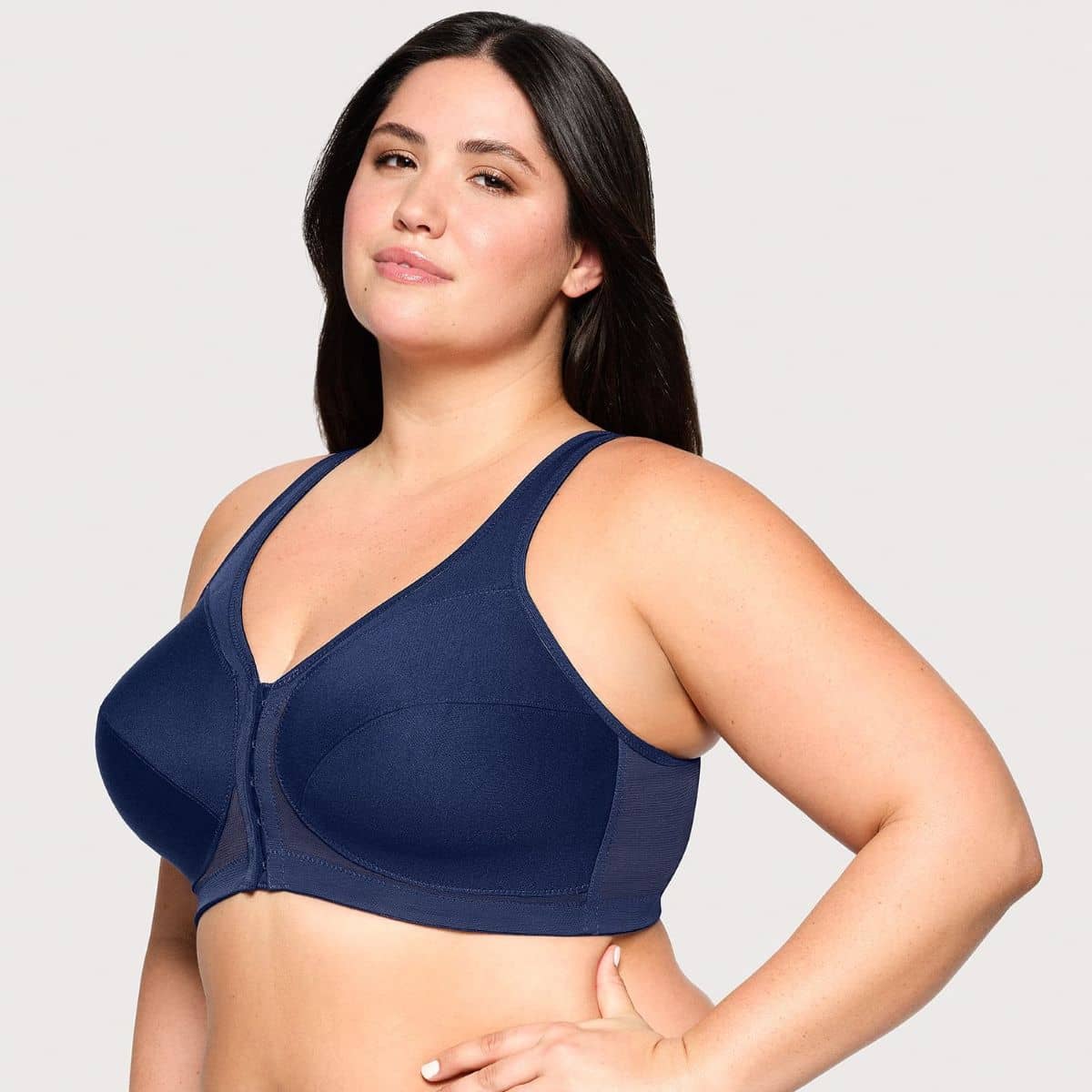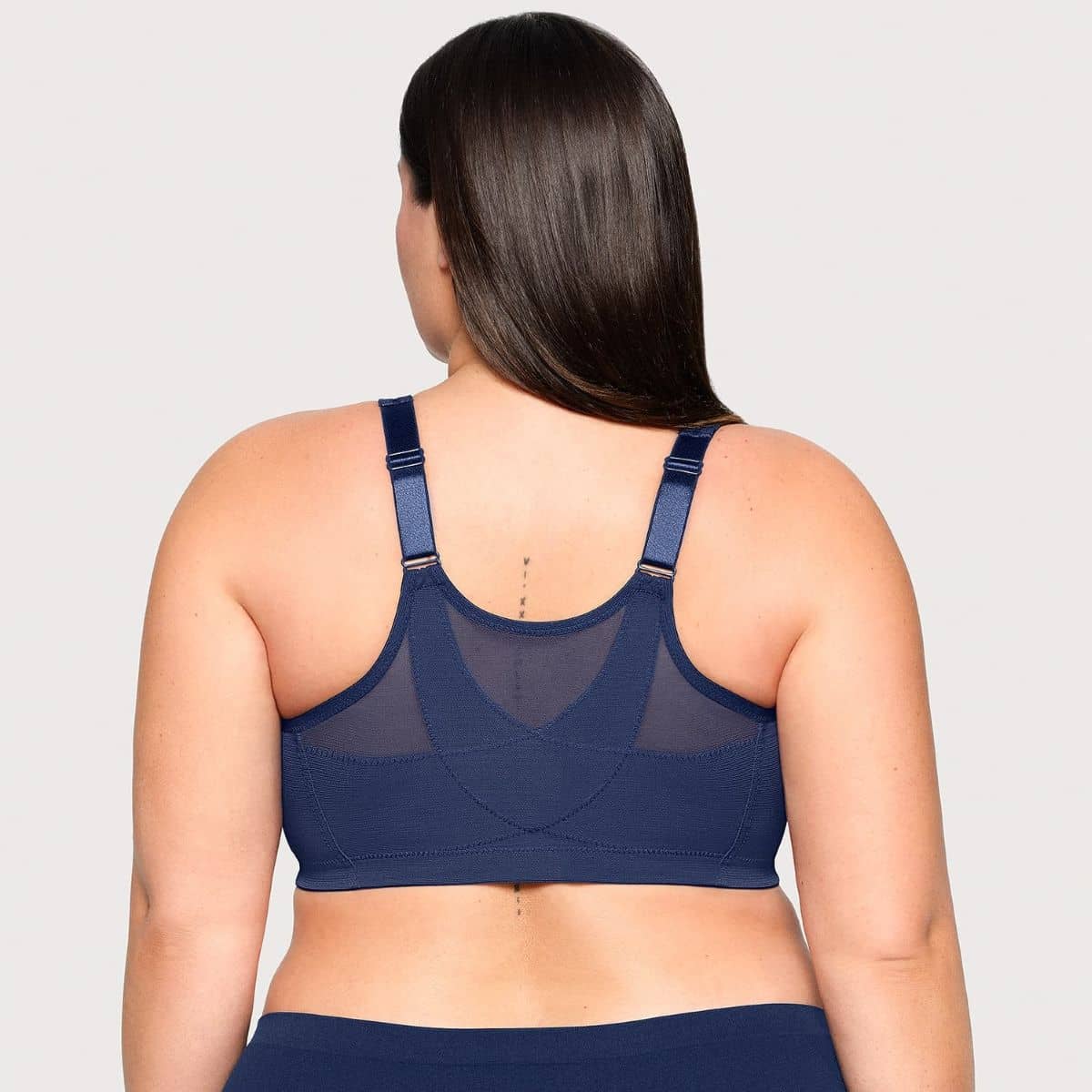 The criss-crossed Cotton-Lycra support bands to support shoulders while gently aiding posture. With a unique cross under and over design for better uplift, separation and support, it features adjustable front hooks and extra wide plush straps to assure ultimate full-figure wirefree support and all day comfort.
