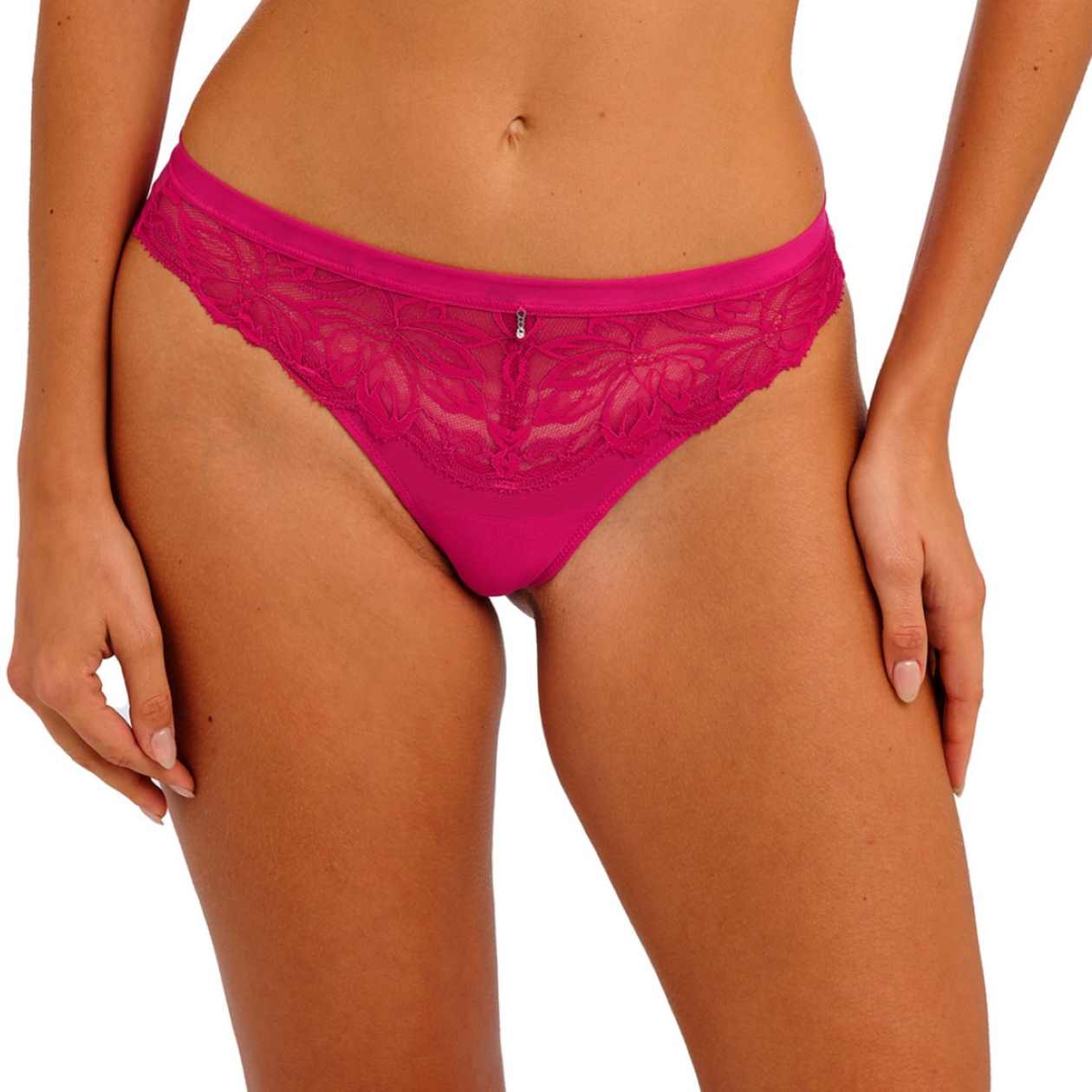 The Abellia Tanga is a beautifully detailed, low-rise brief offering minimal back coverage. It features scallop stretch lace overlaid onto stretch mesh on the front, with the lace's scallop edge continuing along the front legs. A folded stretch mesh waistband ensures comfort, while ultra-smooth selvedge mesh at the back legs provides a no-show, no visible pant line finish. This elegant brief is completed with a delicate pearl drop effect trim at the center front.