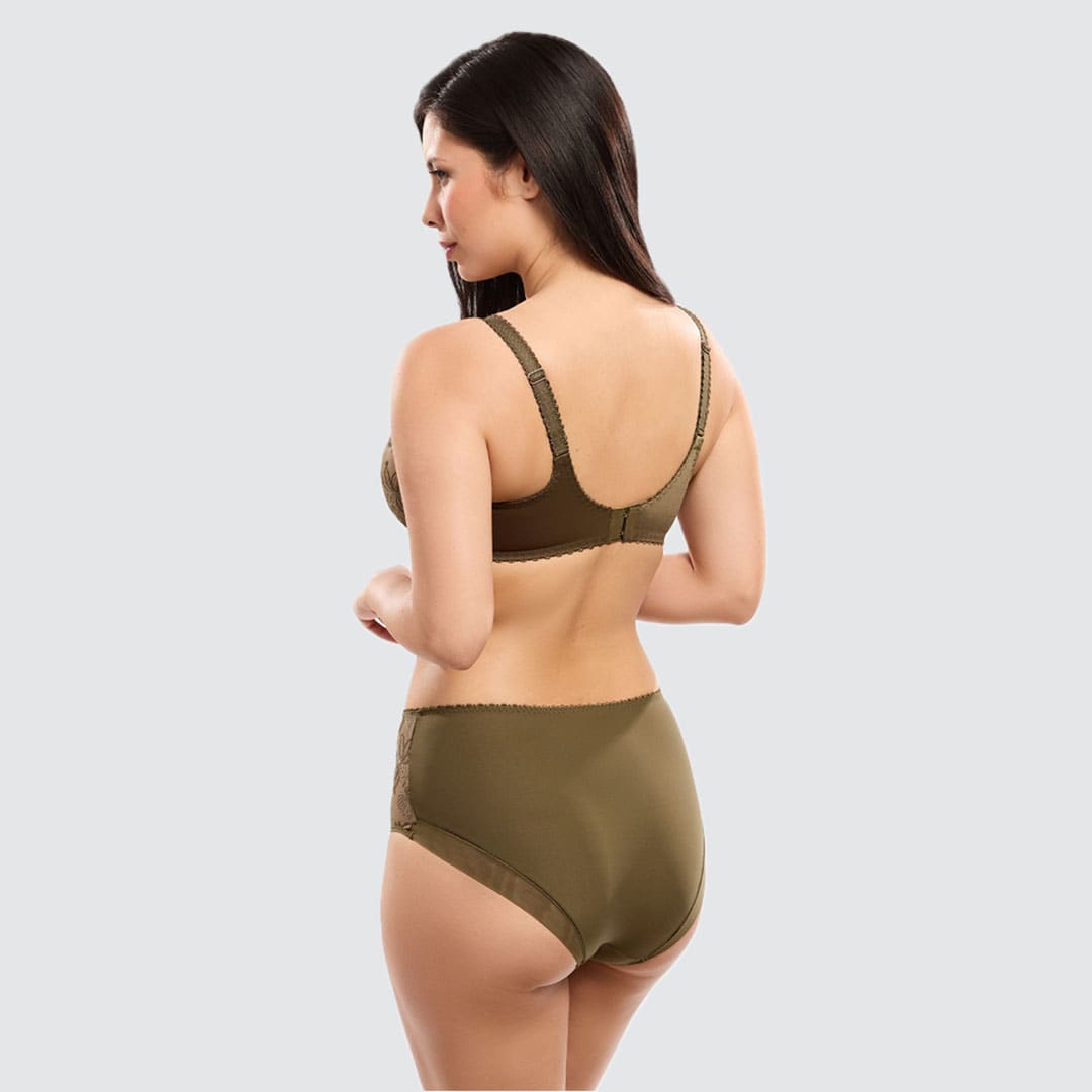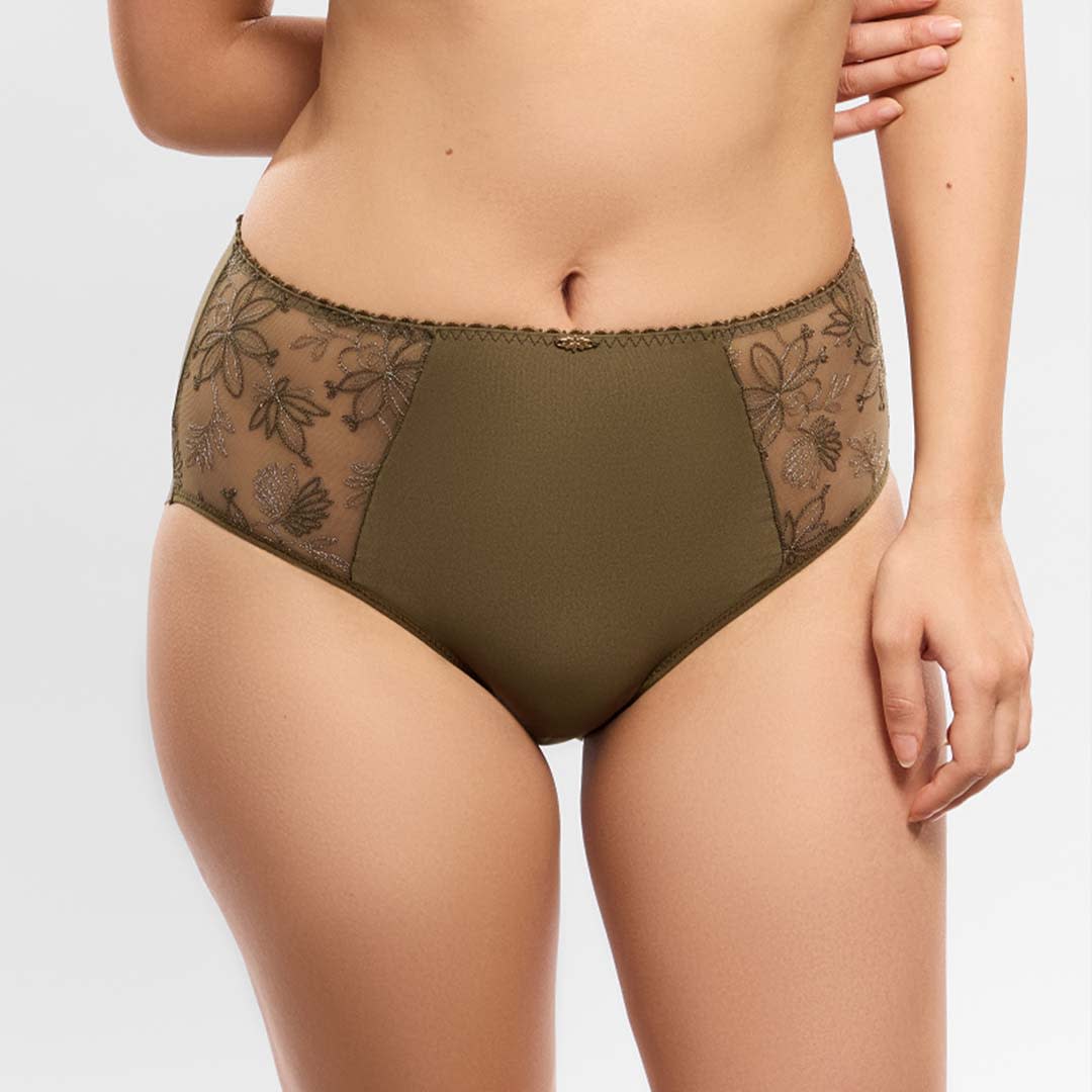The Alix Panties are high-waisted full briefs that offer a flattering and comfortable fit with a soft fabric front and back, accented by delicate embroidered inserts at the sides. The peachy-soft opaque mesh back is elastic-free, ensuring an invisible finish under clothing. A decorative jewel at the front adds a refined, feminine touch to this beautifully crafted design.