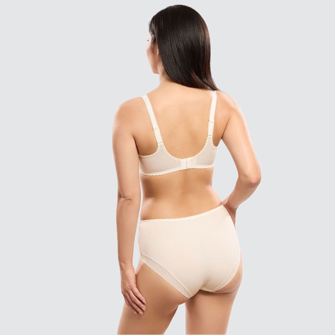 The Alix Panties are high-waisted full briefs that offer a flattering and comfortable fit with a soft fabric front and back, accented by delicate embroidered inserts at the sides. The peachy-soft opaque mesh back is elastic-free, ensuring an invisible finish under clothing. A decorative jewel at the front adds a refined, feminine touch to this beautifully crafted design.