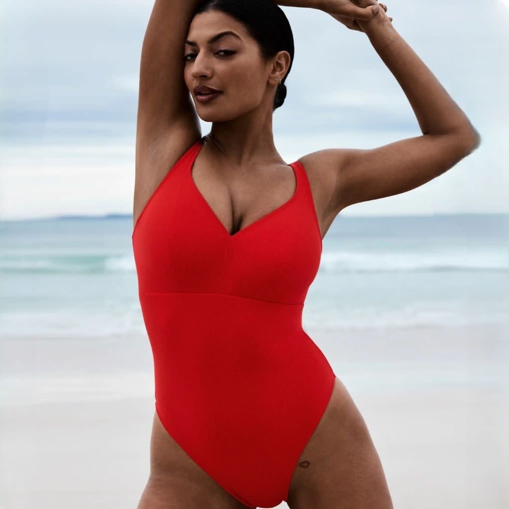 The sexy Aswan Wireless Padded Swimsuit features plunge cups for extra flirtiness.