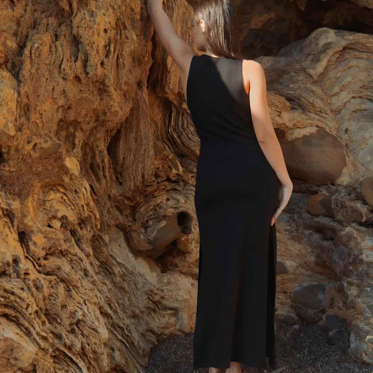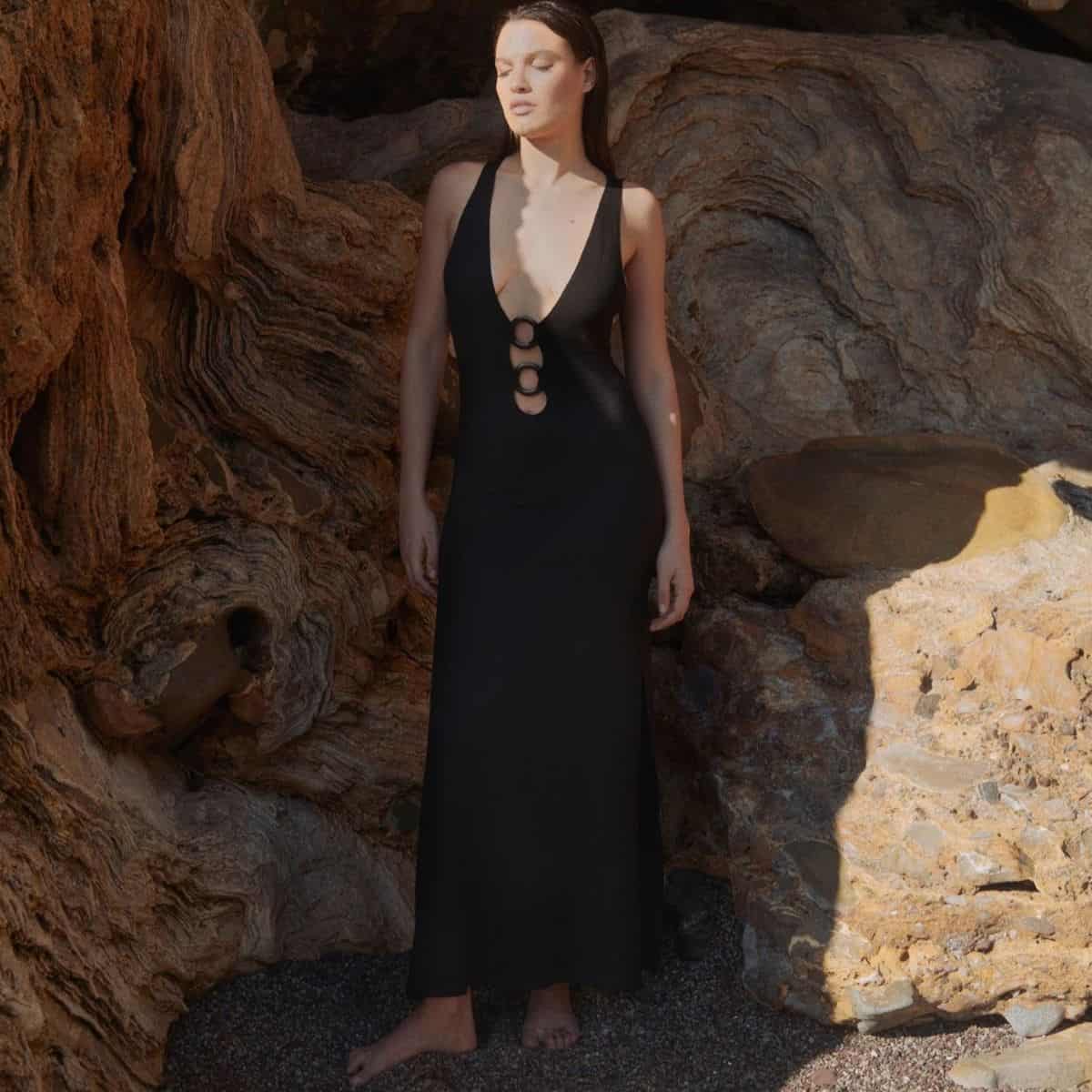 A plunging neckline dressed with two oversized rings to reveal just the right amount of skin. Soft and pleasant knit, light with two long slits on each side.
