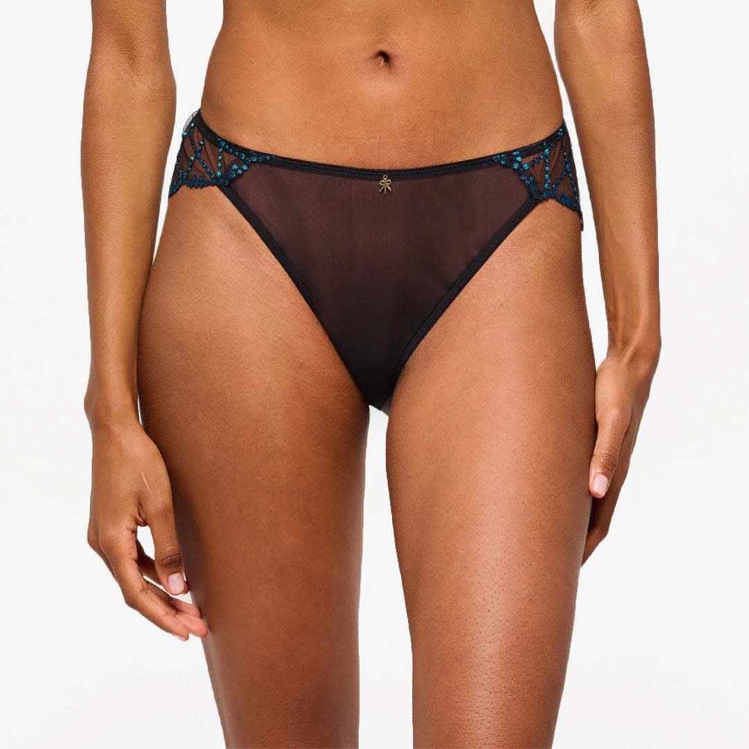 The Avventura Bikini Brief style features Austrian geometric embroidery on sheer tulle, moderate rear coverage, and a cotton-lined gusset.