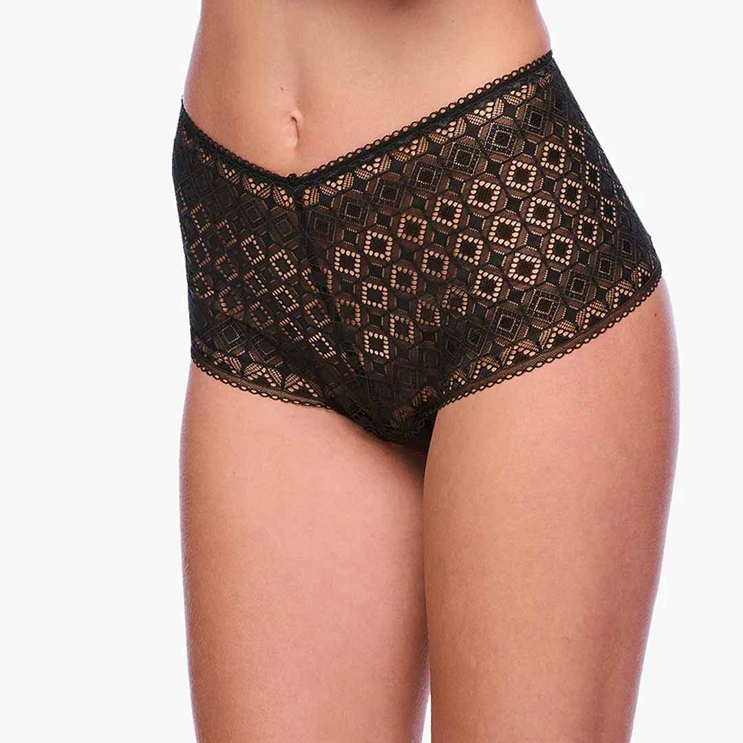 This high-rise lace Basilica Cheeky Brief is crafted from Italian corded lace with a striking geometric pattern. It offers cheeky back coverage, a breathable cotton-lined interior, and a smooth elastic waistband for a seamless, comfortable fit.