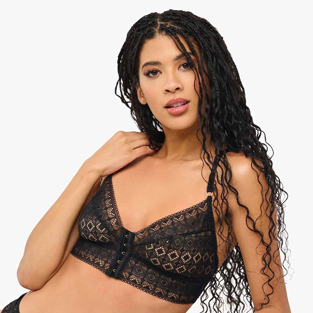 This front-closure wireless bralette features Italian corded lace with a striking geometric pattern. The Basilica Plunge Bralette is designed in a racerback style with elevated lace detailing, combining both elegance and support. The adjustable straps ensure a comfortable, personalised fit.