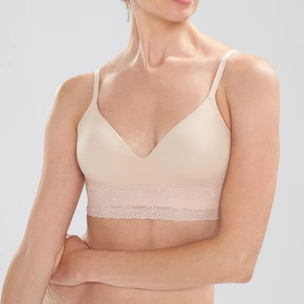 Experience blissful all-day comfort with this lace-trim wireless bralette designed exactly for that purpose. It features stretch foam contour cups that create a smooth, natural shape under clothing, paired with a clean-finish sweetheart neckline that remains invisible under V-neck tops. The longline lace trim beautifully conceals a wide, flat elastic band for added support, while the tall smoothing back enhances comfort and fit. Finished with adjustable shoulder straps adorned with signature gold hardware, this wirefree padded bralette blends softness, support, and style. Plus, it’s OEKO-TEX® Standard 100 certified, ensuring it’s free from harmful chemicals.