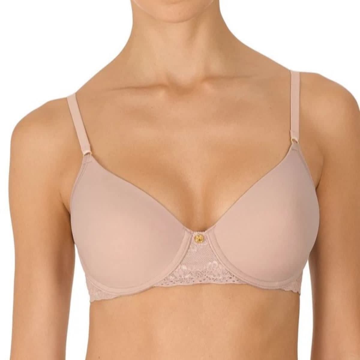 Discover your ultimate everyday essential with this smooth contour t-shirt bra, crafted from a luxurious blend of 360-degree stretch jersey and delicate lace that gently hugs your body for a perfect fit. The lightweight, flexible padding features a soft brushed lining for an incredibly comfortable feel against the skin, making it ideal for all-day wear. A stretch lace band adds a touch of elegance, while adjustable matte-finish straps and signature gold-tone hardware—including a chic Natori charm between the cups—bring a refined finish to this practical yet beautiful bra.