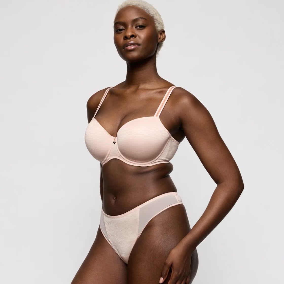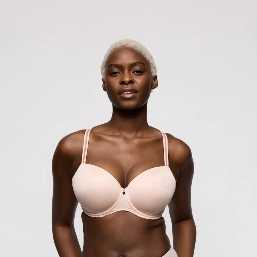 Comfy padded wired bra. Stylish non-transparent design. Stylish straps to hide or show. In pale pink with glitter details.