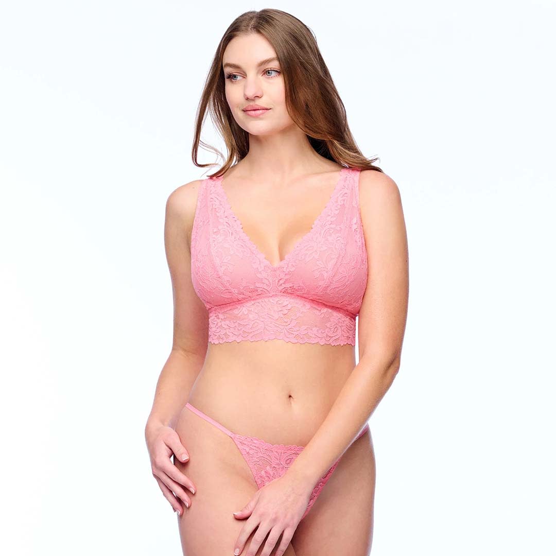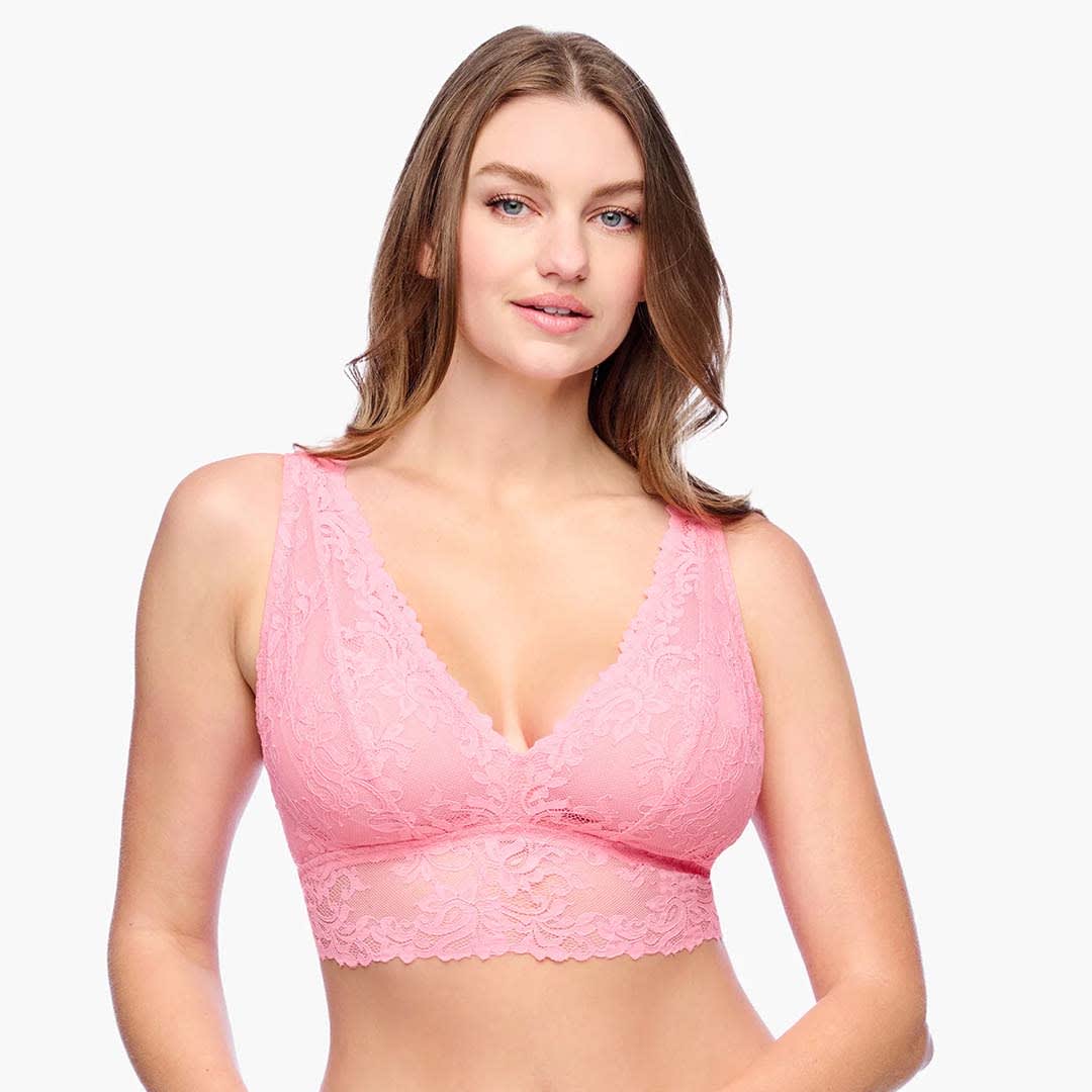 Carmela Curvy Bralette is a wireless lace bralette specially designed for fuller busts with smaller bands, offering both support and comfort. Features non-padded, triangle-shaped cups lined with power mesh for added lift and structure. Finished in an easy pull-on style with adjustable straps for a flexible fit. Hand wash only; do not tumble dry.