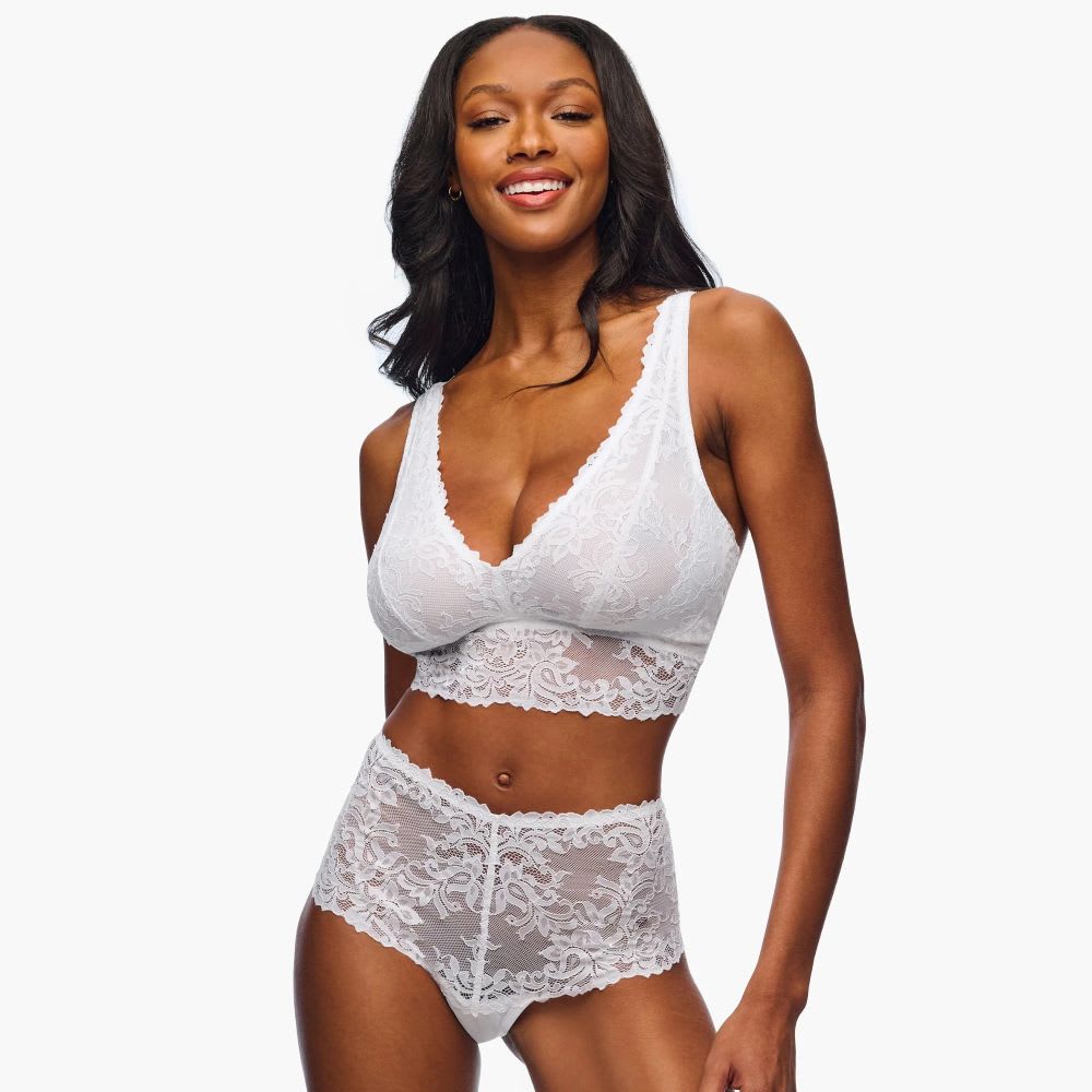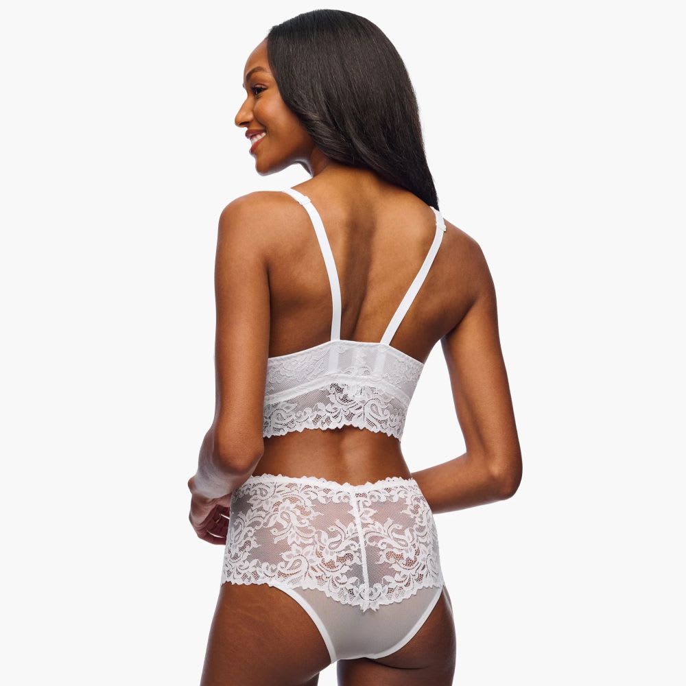 Carmela Curvy Bralette is a wireless lace bralette specially designed for fuller busts with smaller bands, offering both support and comfort. Features non-padded, triangle-shaped cups lined with power mesh for added lift and structure. Finished in an easy pull-on style with adjustable straps for a flexible fit. Hand wash only; do not tumble dry.