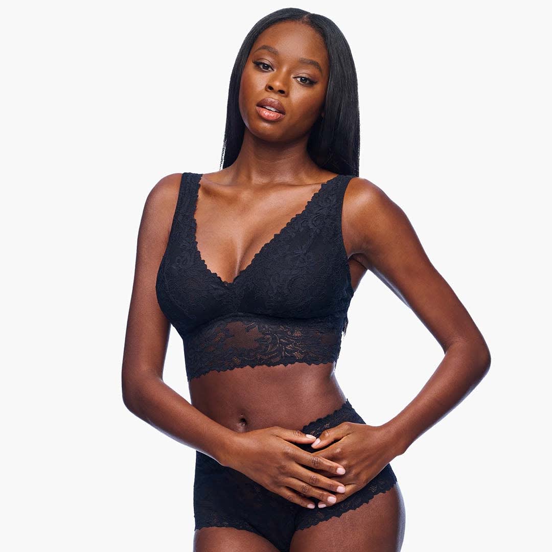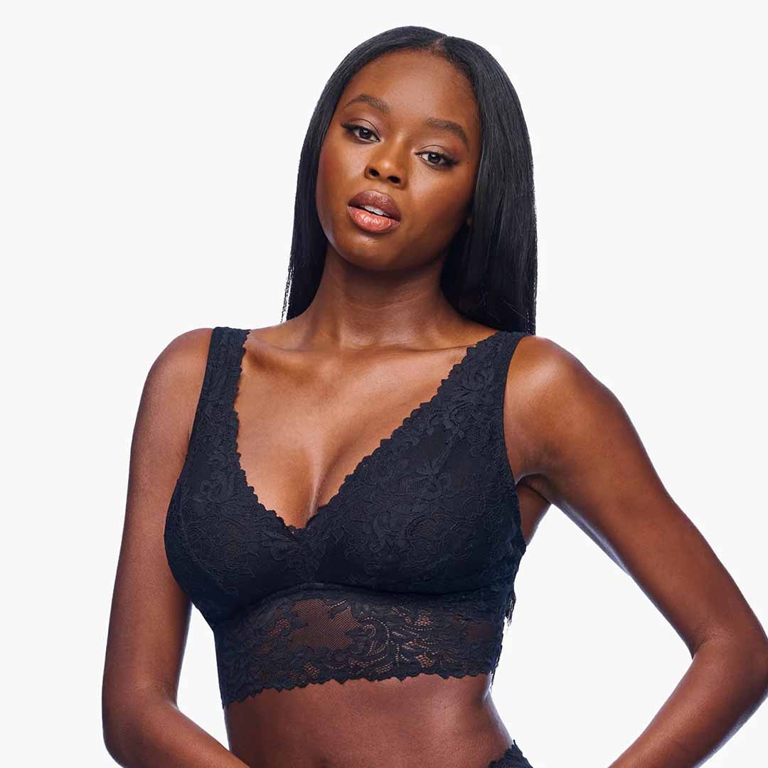 Carmela Curvy Bralette is a wireless lace bralette specially designed for fuller busts with smaller bands, offering both support and comfort. Features non-padded, triangle-shaped cups lined with power mesh for added lift and structure. Finished in an easy pull-on style with adjustable straps for a flexible fit. Hand wash only; do not tumble dry.