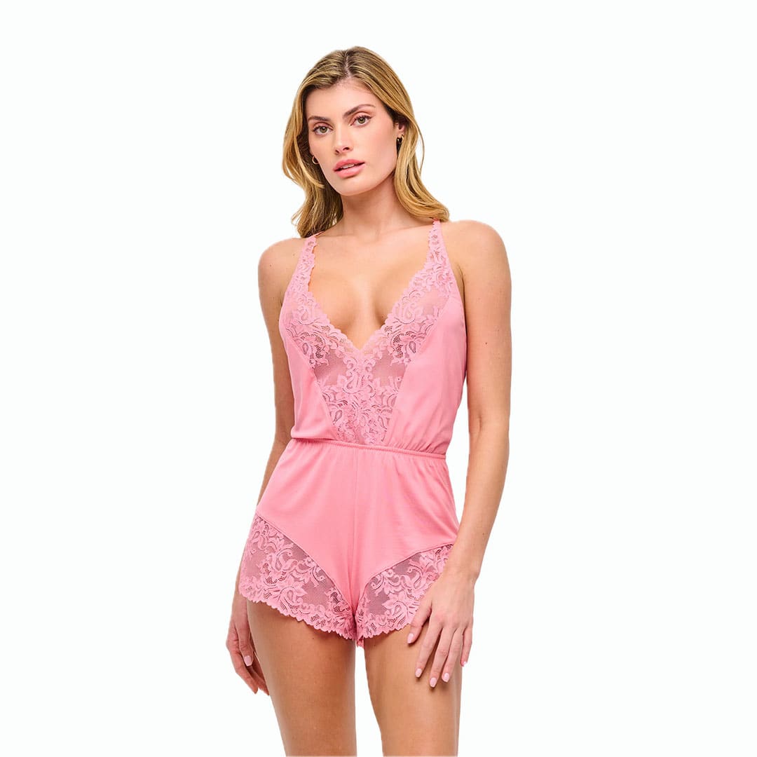 A soft modal romper designed for sleep or lounge, featuring a dramatic deep V-plunge front and modern lace detailing for a touch of allure. The Carmela Modal Romper features adjustable straps and a tie-back closure for ultimate comfort and a customizable fit. Hand wash only; do not tumble dry.