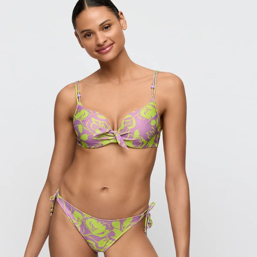 Cute bikini briefs with playful summery waist ropes. Trendy print on glitter fabric.