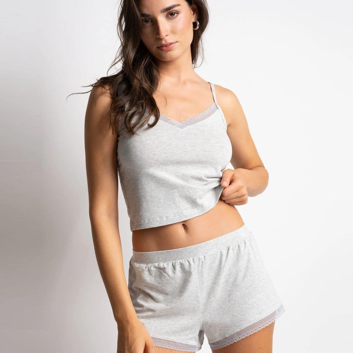 A crop top with thin straps. Short tank top, comfortable for everyday use to relax or sleep in style. Designed from an ultra-soft blend of cotton and modal, embellished with a refined lace trim for a feminine and elegant touch.