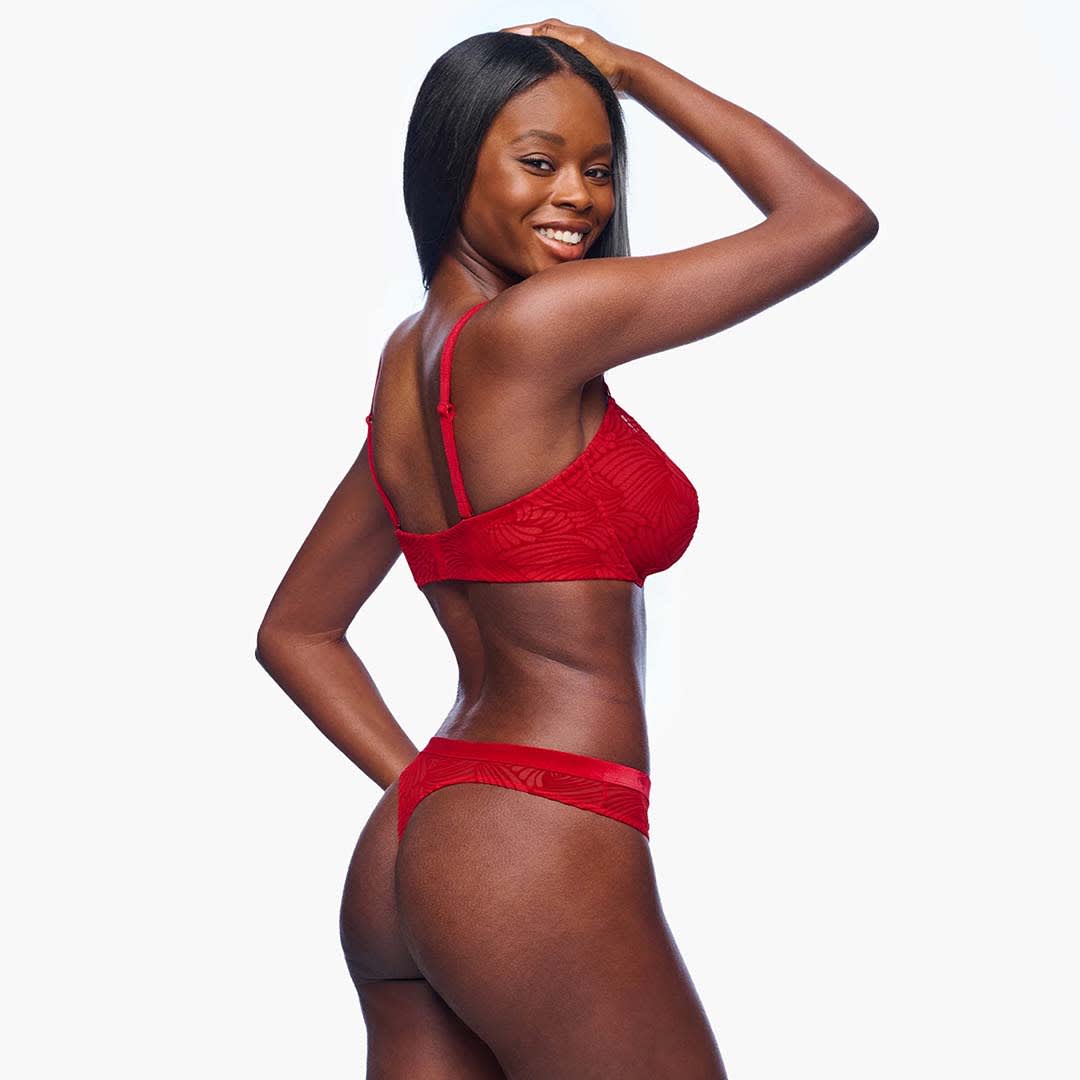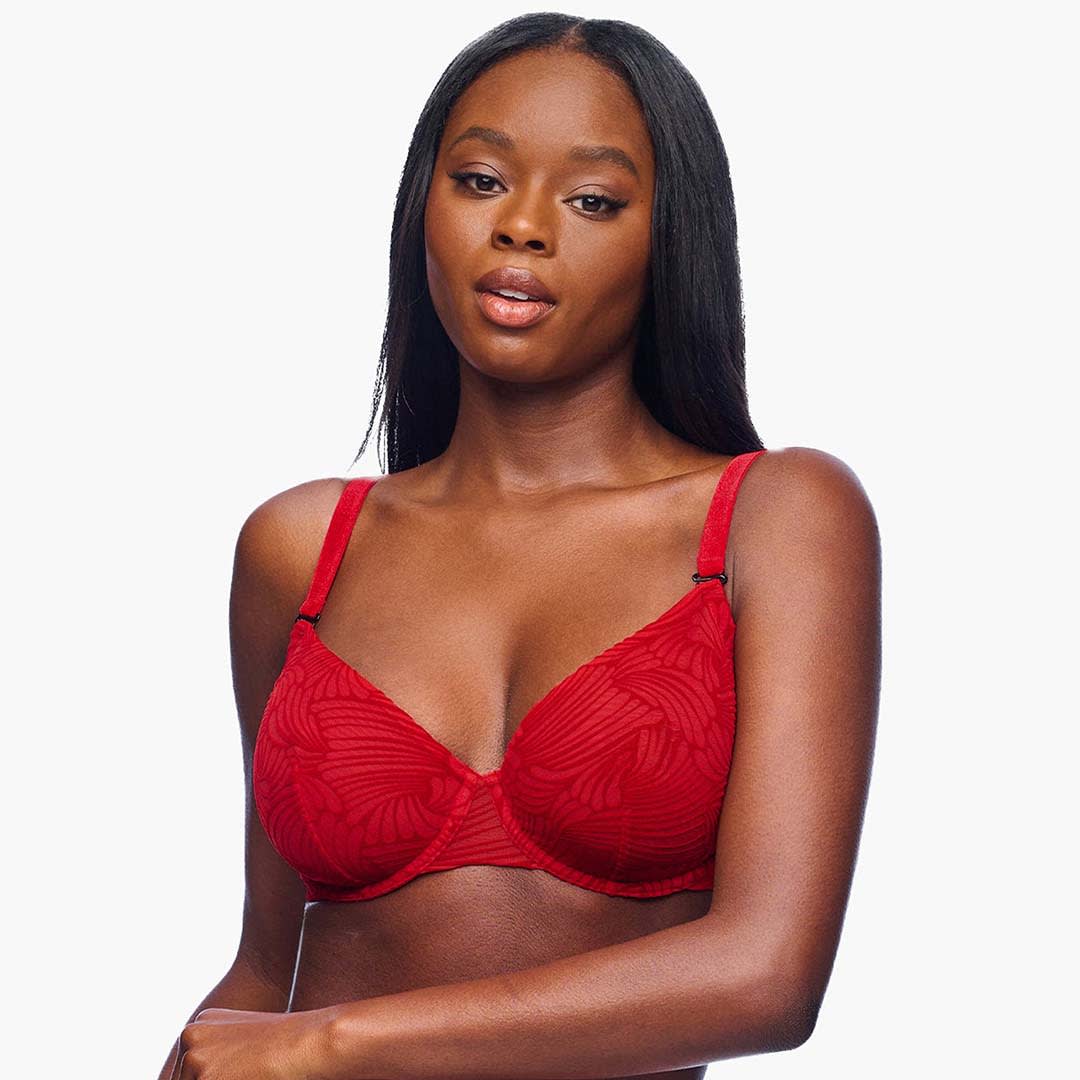 An underwire, unlined Clancy Demi Bra offering optimal support and coverage in sizes up to a G cup, with a sheer everyday design, hook-and-eye back closure, and luxe adjustable velvet straps.