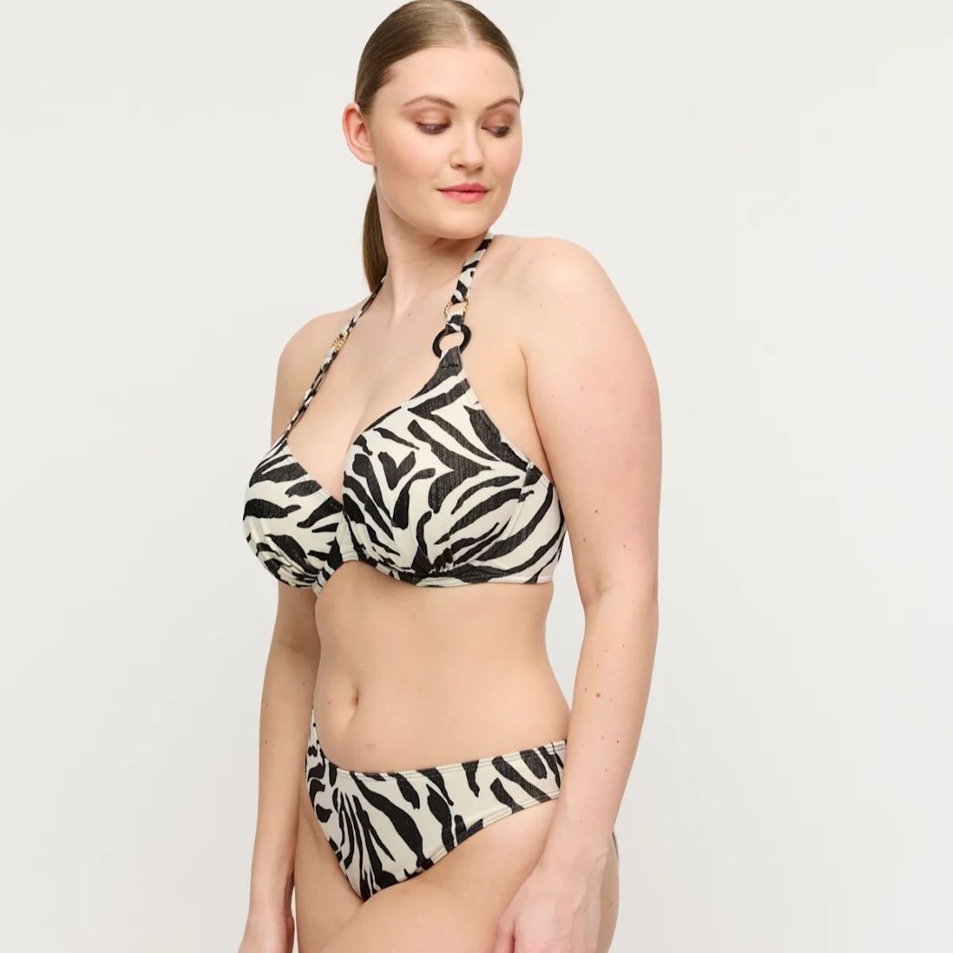 Poolside glam was never this comfy. Pure luxury! Chic and sultry plunge top with airy half-padded cups. Cool print with a glitter effect.