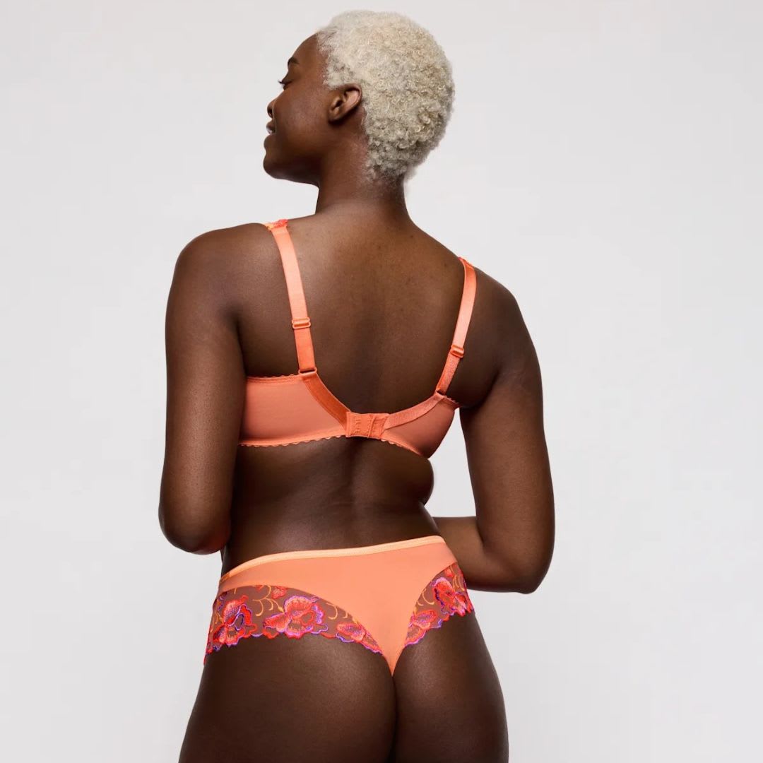 A sexy and comfortable full cup bra with colorful all-over embroidery that continues onto the straps. The contrasting trim adds the finishing touch.