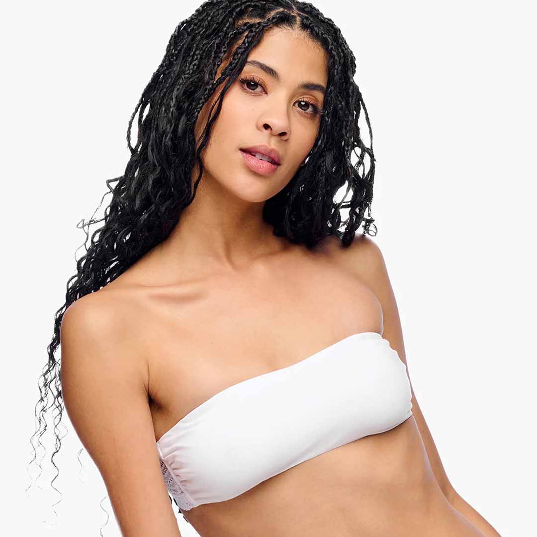 A Dolce Bandeau Bra is a wireless bandeau bra crafted from ultra-soft cotton and delicate chevron lace. Designed with non-padded, smooth cotton cups for natural comfort, and a pull-on style featuring a lace back. Silicone grips at the top and bottom prevent slipping, while side boning provides extra support. For best care, hand wash in cold water and avoid tumble drying.