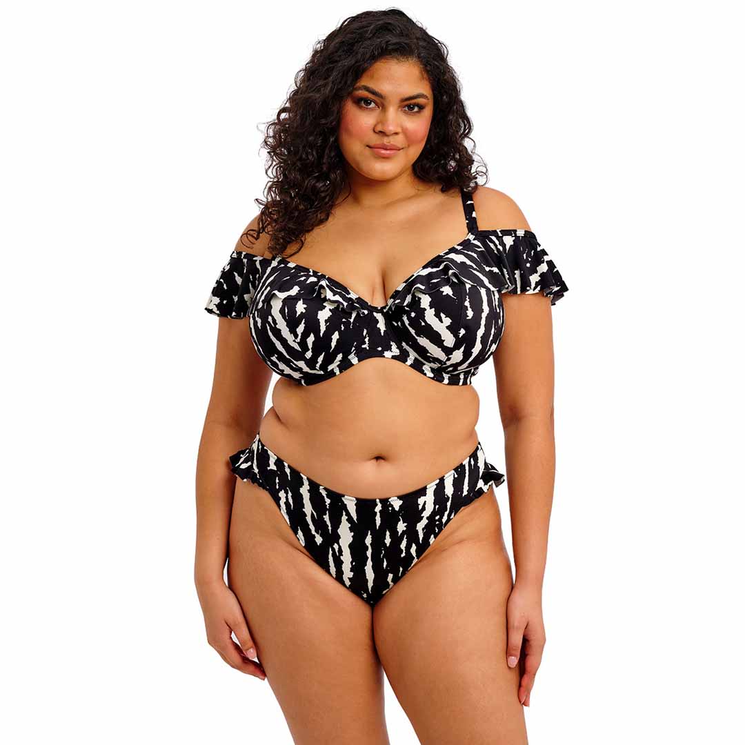 This underwired plunge bikini top features slim straps and a versatile ruffle that can be worn on or off the shoulders. Echo Shell Underwire Plunge Bikini Top is fully lined with a light yet supportive fabric, giving you the look of a bikini with the dependable fit of an Elomi lingerie bra. The cups, ruffle, and back are crafted from a lightweight printed fabric with LYCRA® XTRA LIFE™ for enhanced durability, while the powernet-lined back offers added support. Adjustable shoulder straps allow for a customised fit.