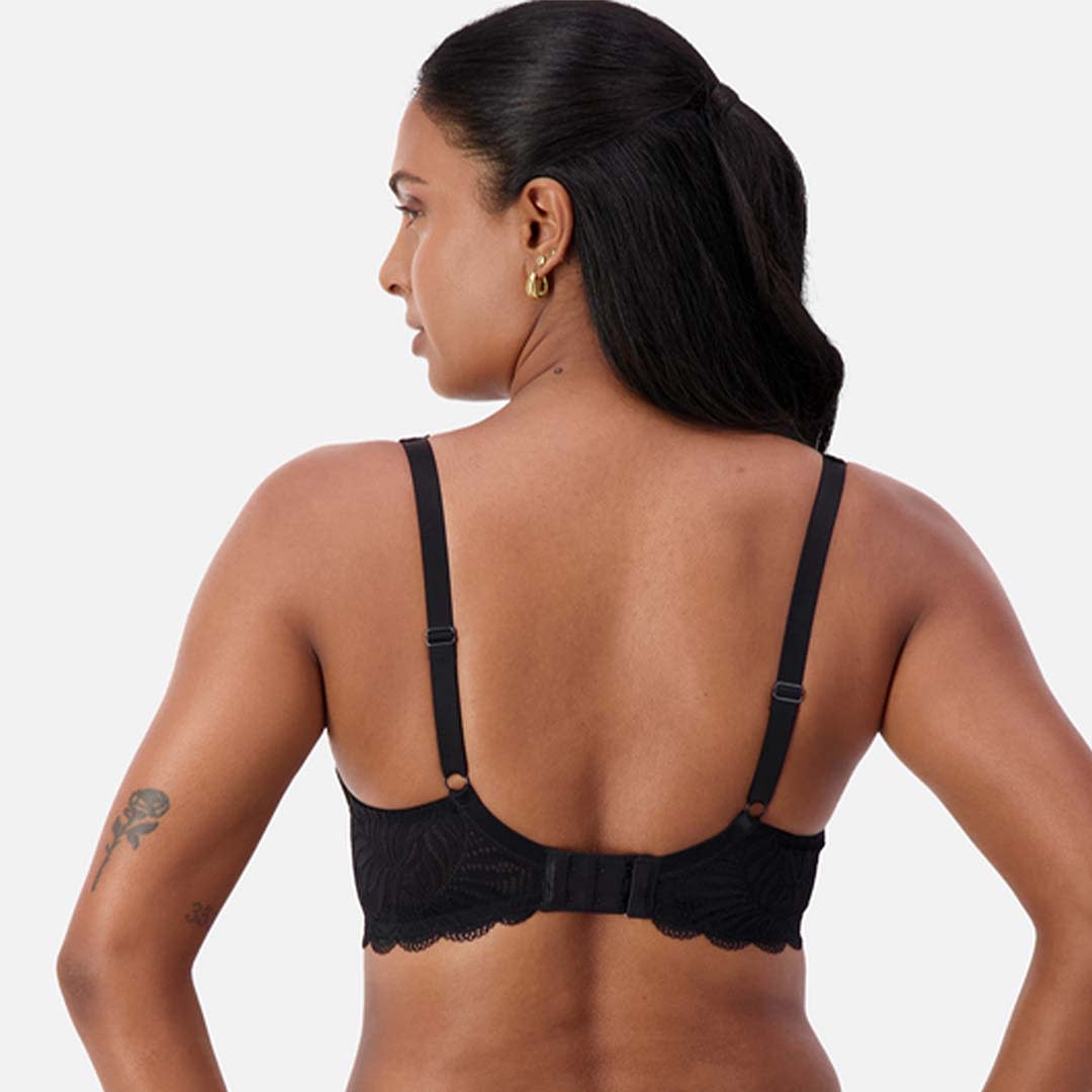 The Essential Lace Balcony Bra offers comfortable everyday support with elegant lace detailing for a refined look. Its underwire, non-padded three-piece cups create a beautifully rounded silhouette, while wide adjustable lace straps and fully lined cups and back panels provide added support.