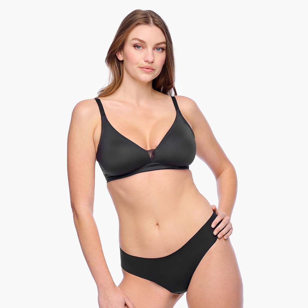 A wireless bralette crafted in smooth microfiber with a supportive elastic underbust band. The Evolution Curvy Bralette features built-in side slings that provide additional shaping and support, while the U-shaped ballet back ensures comfort and stability. Designed with adjustable straps and a secure 4x2 hook-and-eye back closure. The Curvy fit is specially tailored for DD cups and above.