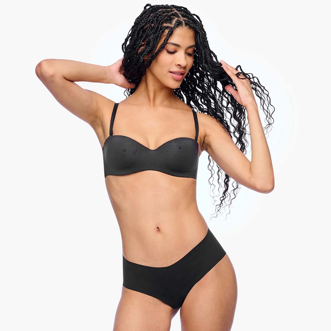 The Evolution Strapless Bra features a smooth molded microfiber finish for a flawless silhouette, silicone elastics for secure support, removable adjustable straps for versatility, and a classic hook-and-eye back closure for confident, all-day wear.