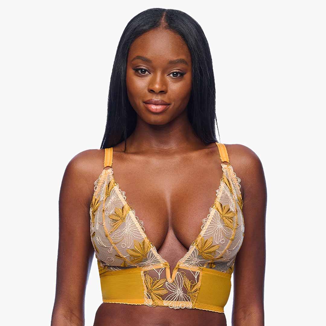 This wireless Fiorita Curvy Longline Bralette features a V-wire plunge neckline that offers gentle support while enhancing natural shape. Designed for smaller bands and fuller cups, it combines custom French embroidery with soft stretch mesh for a luxurious feel. Finished with wide, adjustable straps and an elastic underband for added comfort and a secure fit. Hand wash only and avoid machine drying to maintain its delicate craftsmanship.