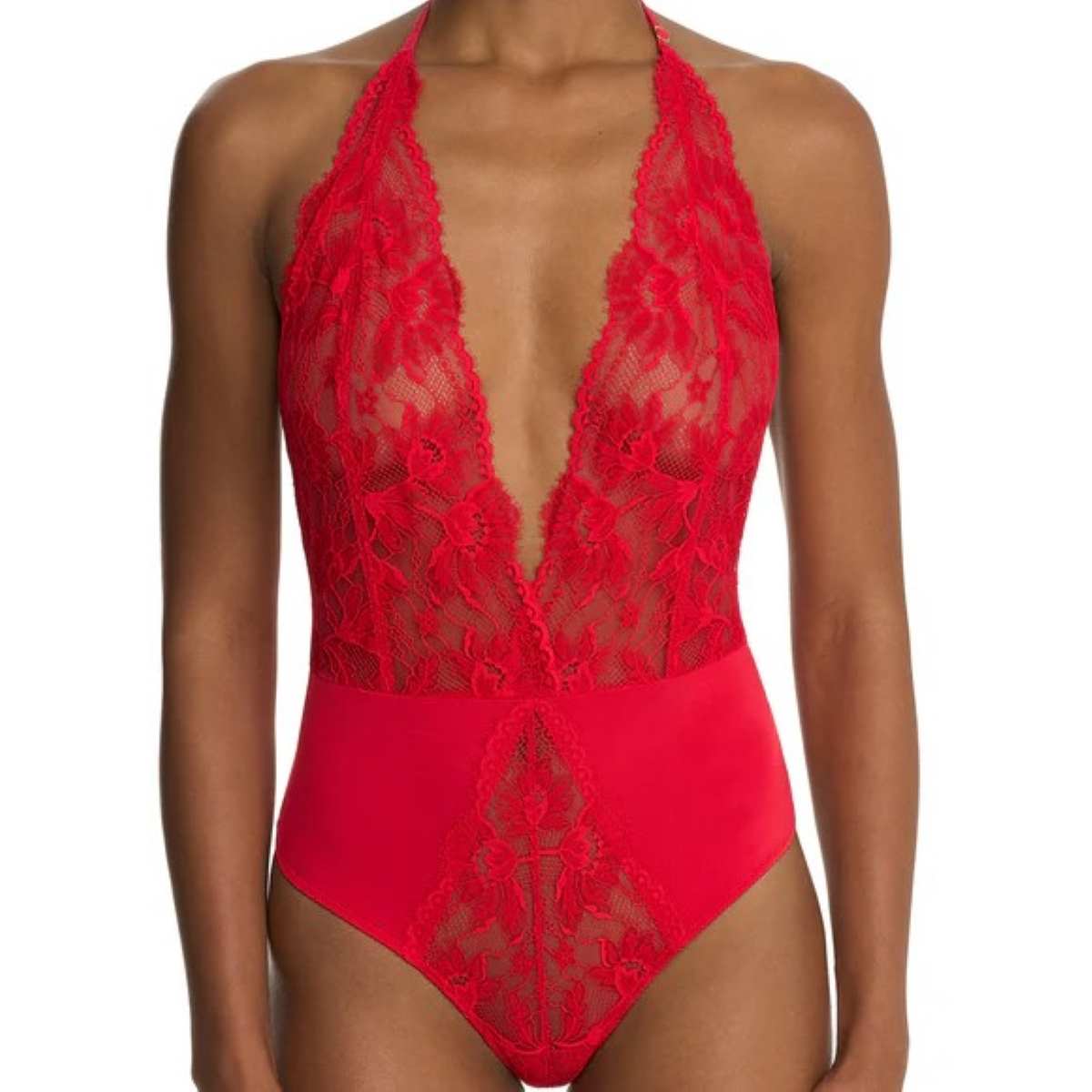 Captivating and feminine, this romantic lace teddy features a plunging neckline, cheeky thong back, and a stunning mix of soft stretch jersey and floral scalloped lace. The adjustable ruched halter and back straps contour beautifully to your shape, creating a flawless, personalised fit. Made with OEKO-TEX® Standard 100 certified materials, it’s as comfortable as it is alluring.