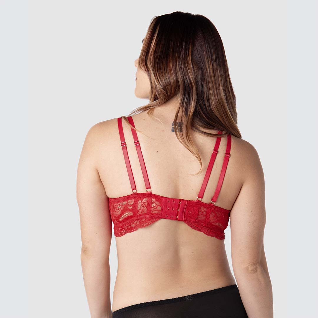 Heroine Plunge Bra with fine twin straps and flex wire support. Soft scalloped lace with sheer mesh lining drops down to a cotton side sling. Plunging yet supportive shape, perfect for pregnancy, breastfeeding, and beyond.