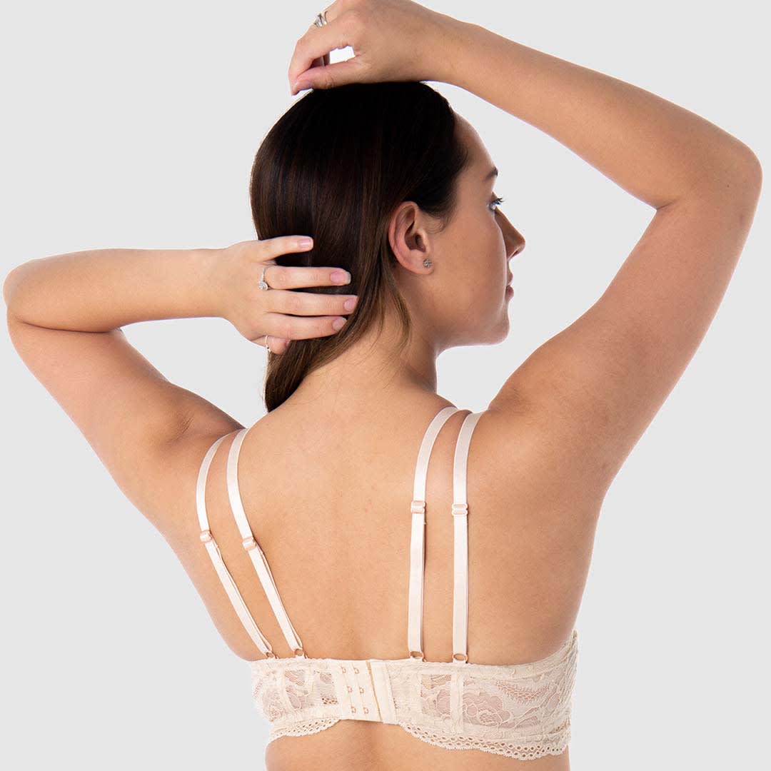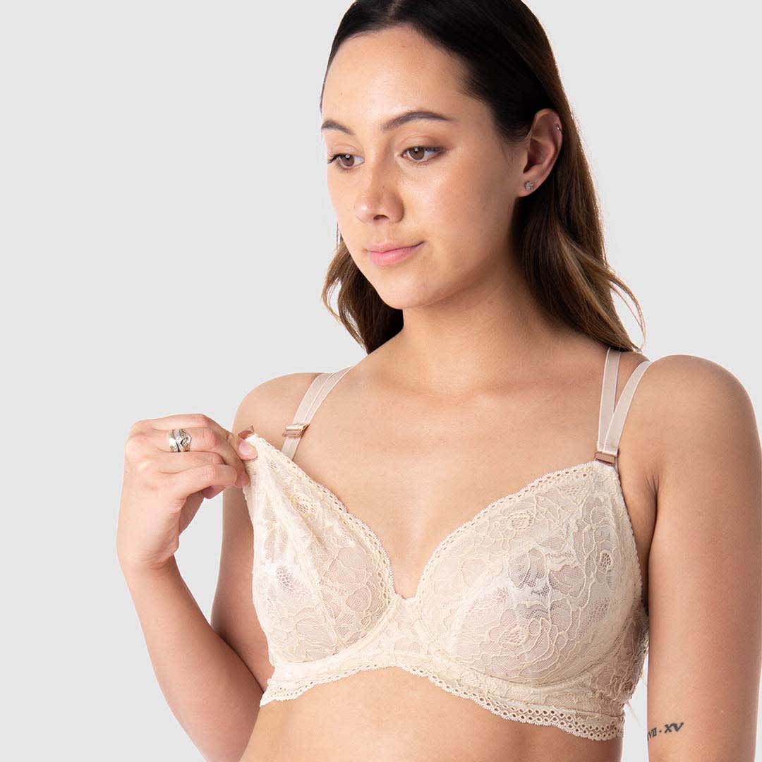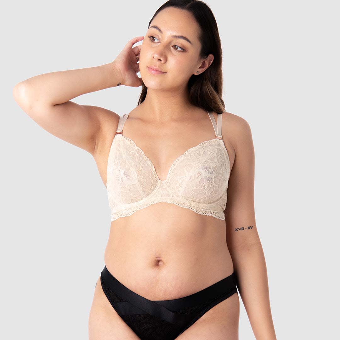Heroine Plunge Bra with fine twin straps and flex wire support. Soft scalloped lace with sheer mesh lining drops down to a cotton side sling. Plunging yet supportive shape, perfect for pregnancy, breastfeeding, and beyond.