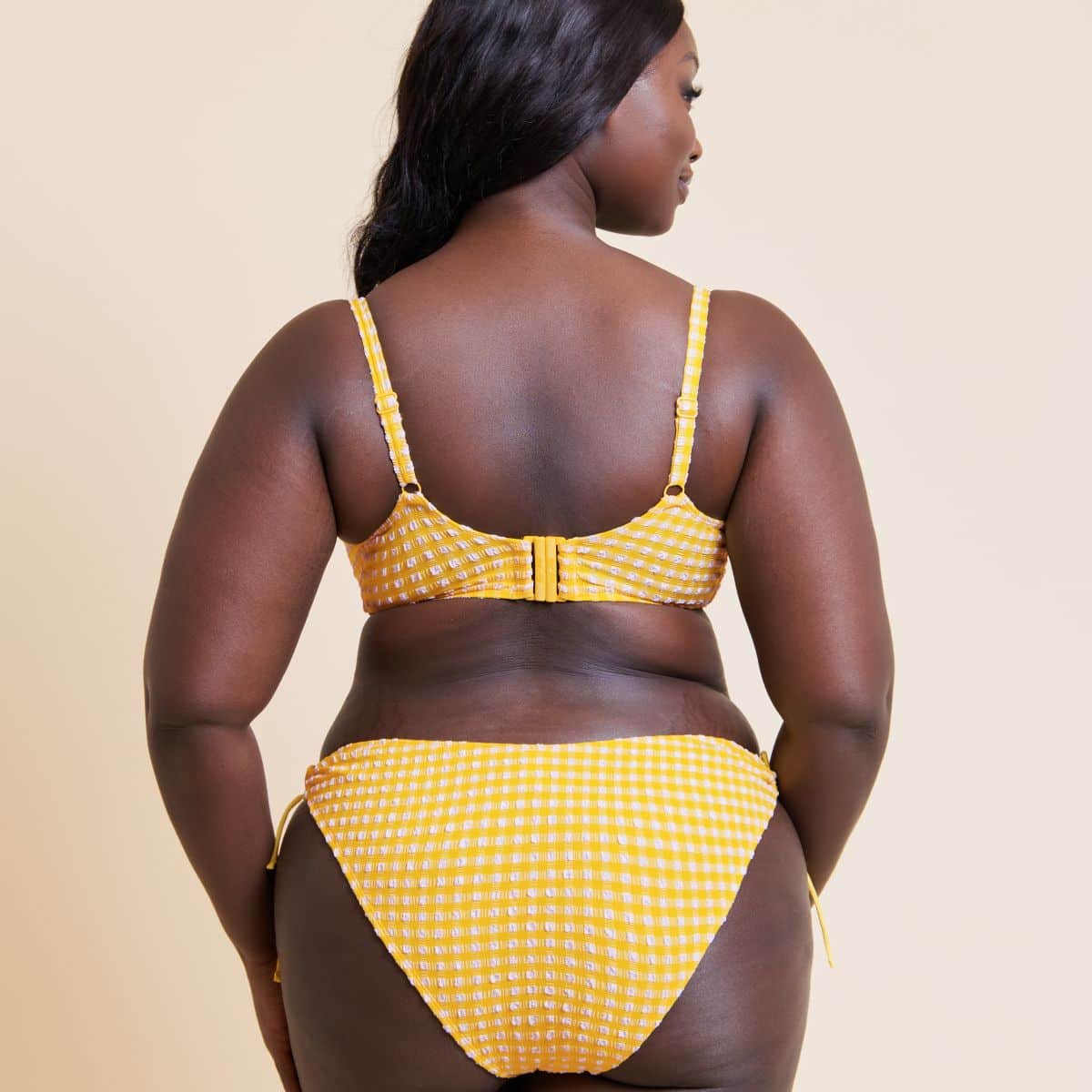 A dry-touch crinkled gingham swim fabric. Non-padded underwired scooped balcony bikini with stretch fit cups and cute tie detail.