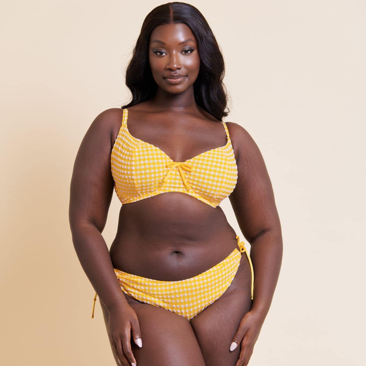 A dry-touch crinkled gingham swim fabric. Matching cut cheeky bikini brief with gathered tie-side.