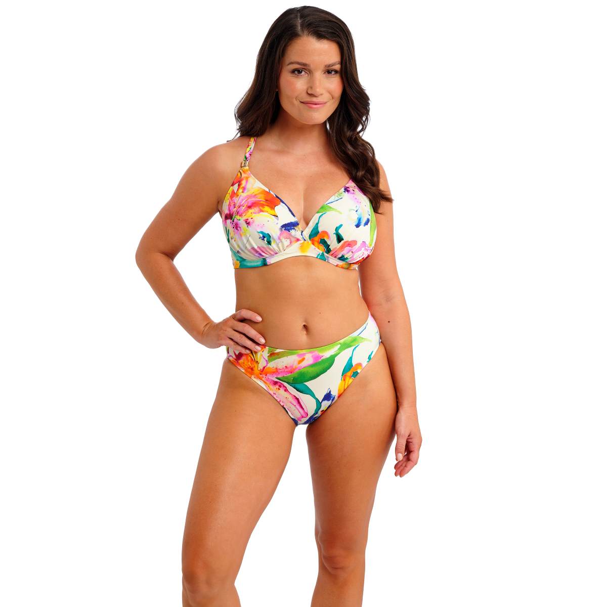 Add a touch of joy and escapism to your holiday wardrobe with the Iguazu Falls collection. Bursting with vibrant colour pops on a soft off-white base, this style features a flattering deep plunge neckline with gentle gathers for shaping, lined cups for support, and powernet wings with a deep clasp for added anchorage. Convertible, fully adjustable straps allow versatile styling, finished with metallic gold trim that won’t heat up in the sun.