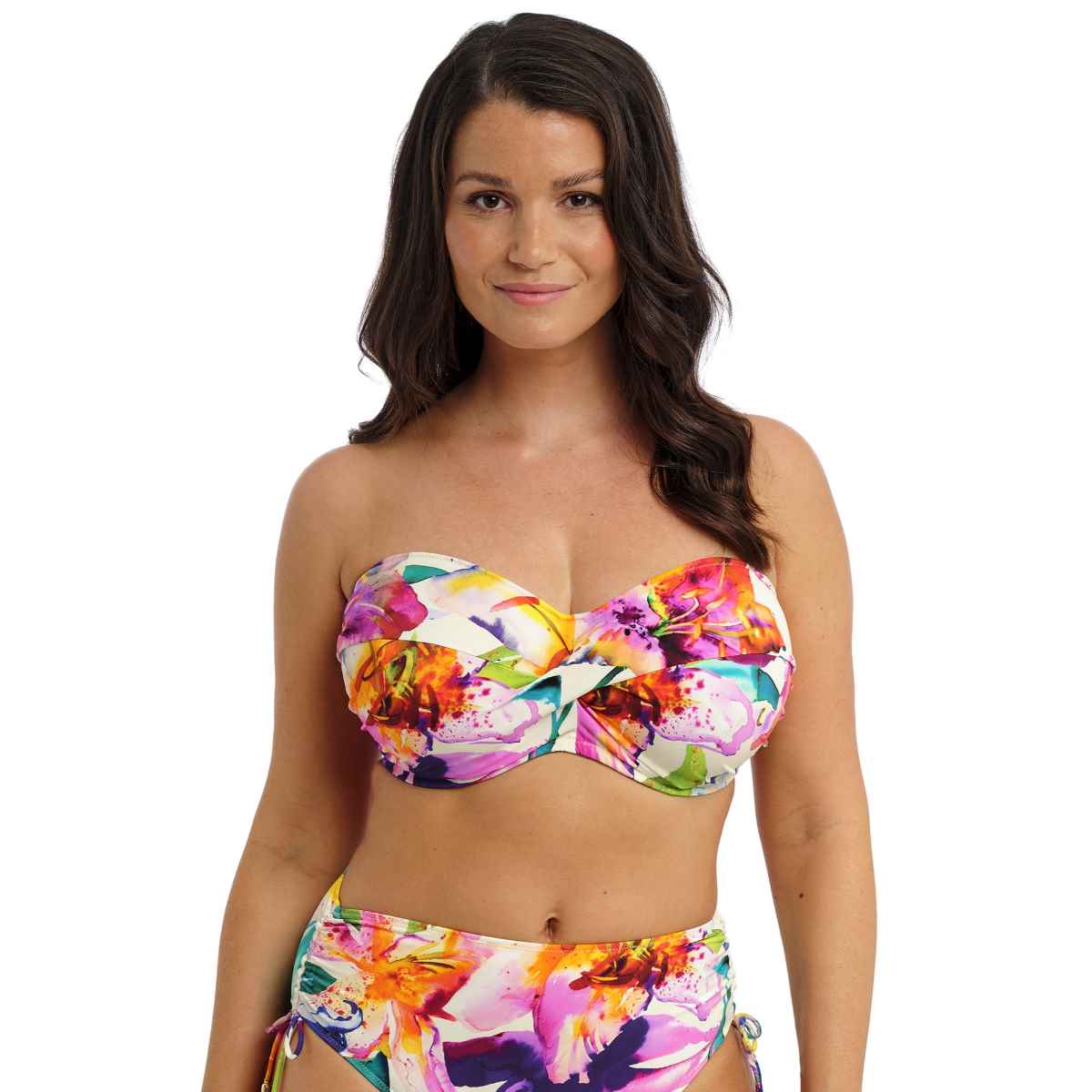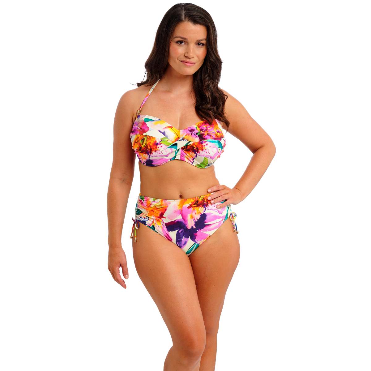 Add a touch of joy and escapism to your holiday wardrobe with the Iguazu Falls collection. Bursting with vibrant colour pops on a soft off-white base, this swimsuit features lightly padded cups for a smooth, rounded shape, a flattering twist front neckline, and concealed underwire for added support. Finished with detachable scarf tie straps and metallic gold trim that won’t heat up in the sun — perfect for stylish comfort under the sun.