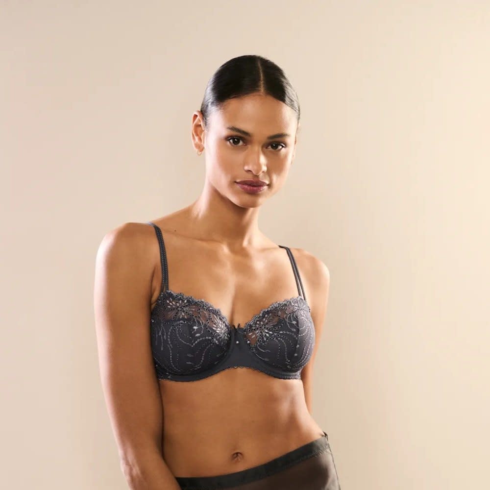 Elevate your lingerie collection with this chic and luxurious balcony bra from Marie Jo's Jane range, featuring exquisite embroidery. The padded cups have soft foam at the bottom for added support, while the high-gloss embroidery on the top and lace border along the neckline add a touch of sophistication. The bra also features underwiring for extra support and fine adjustable straps for a personalized fit. Complete your look by pairing it with matching coordinates from the Jane range.