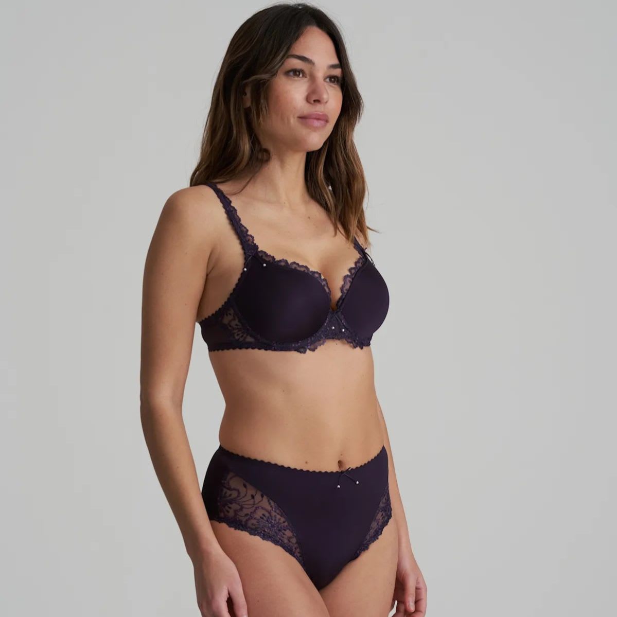 Get the confidence to wear any outfit with this Marie Jo Jane bra that will give you a smooth and flawless silhouette. The deep plunge neckline and the smooth padded cups make it perfect to wear with any low-cut or tight-fitting top. The intricate feminine embroidery on the cups and adjustable straps adds an extra touch of elegance. With underwired cups and a traditional hook and eye back closure, you can have both comfort and support. Complete the look by pairing it with other items from the Jane collection for a coordinated style.