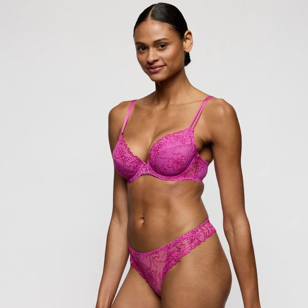 The Jane lingerie collection by Marie Jo offers a perfect blend of style and comfort for all-day wear. Indulge in luxury with this elegant push-up bra adorned with intricate floral embroidered cups. The push-up padding enhances volume and creates a flattering uplifted cleavage effect. With split spaghetti shoulder straps and a semi-sheer tulle back, this bra adds a subtle flirty finish to your look. The underwire provides additional support and structure. Coordinate your lingerie look by pairing this push-up bra with matching pieces from the Jane collection by Marie Jo.