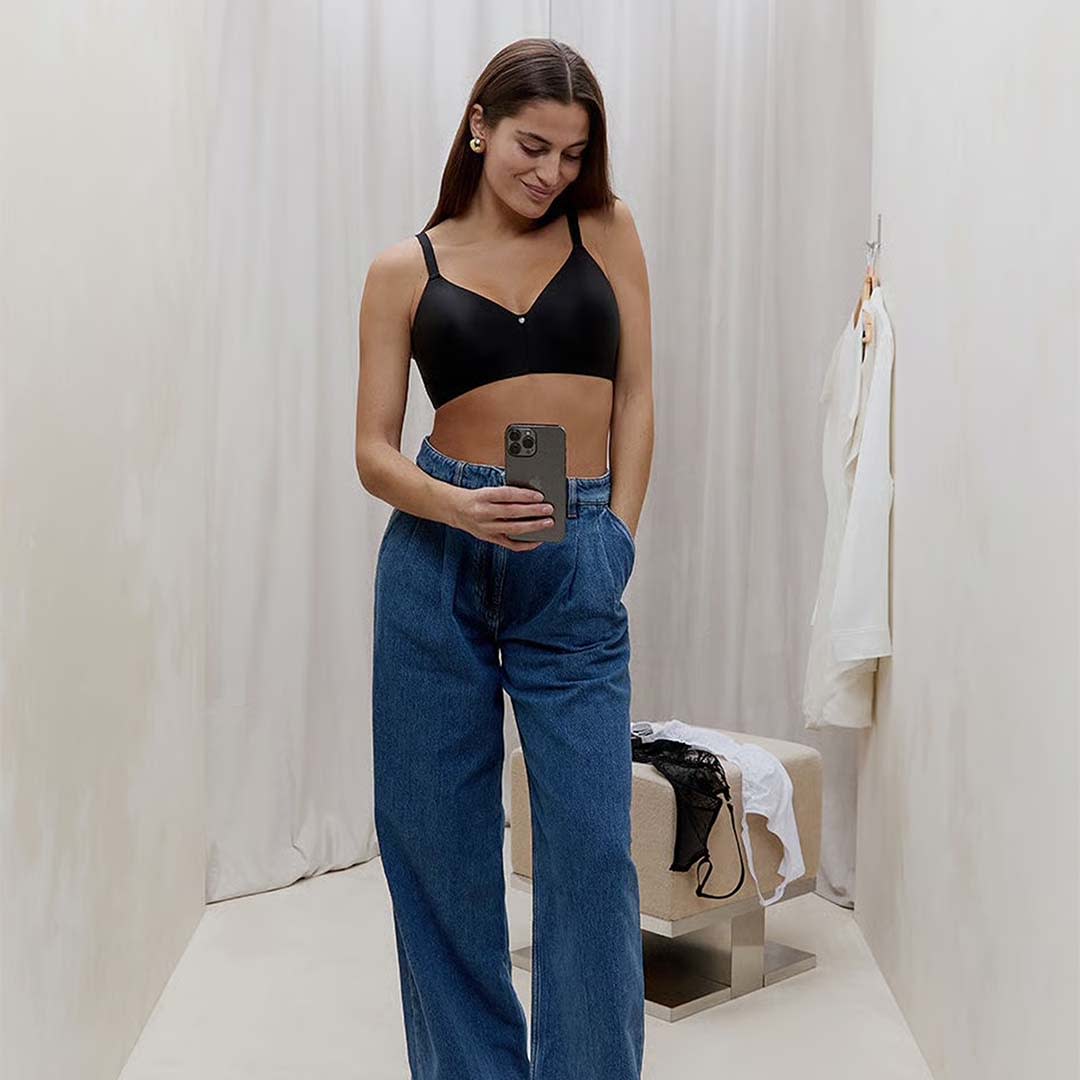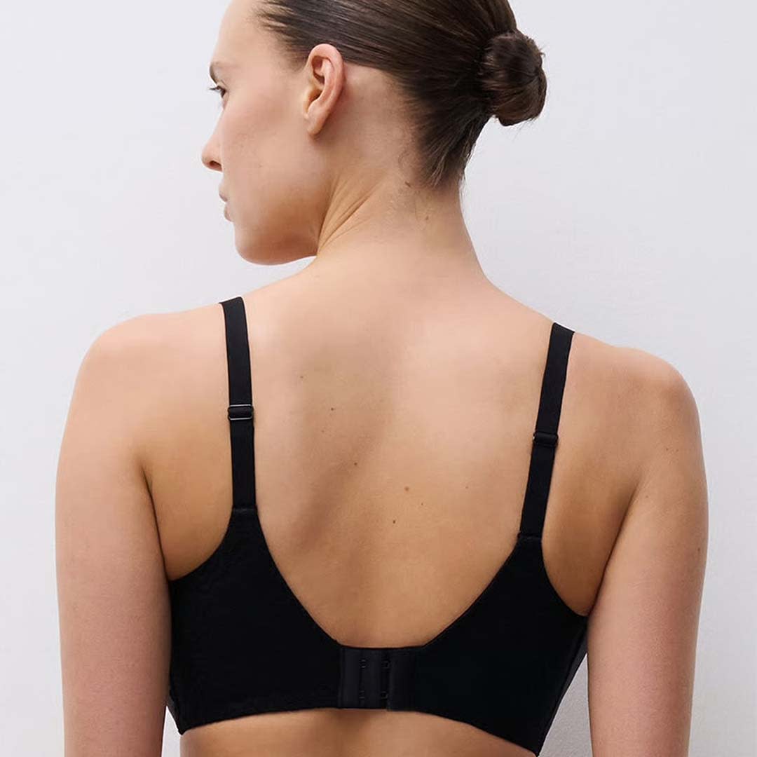The Jolie Wirefree T-Shirt Bra with contour cups for a naturally rounded shape, flexible side support, a lined lace back for added stability, adjustable straps, and a delicate jewel detail at the centerfront.