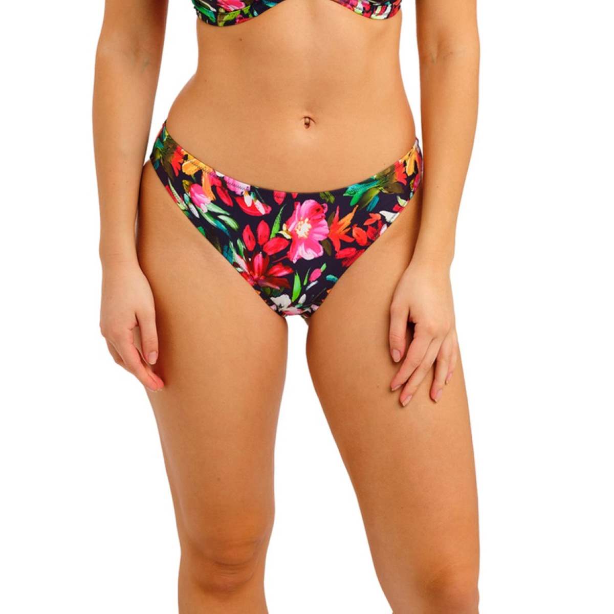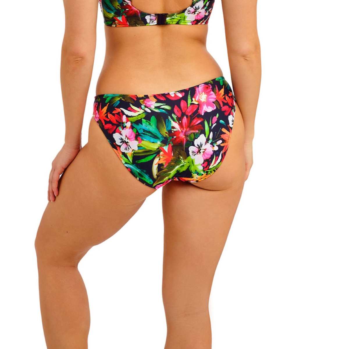 Hit the waves in style with Kailua Shores, our bold tropical print featuring hot pinks, fiery oranges, and lush jades on a deep navy base, accented with gold-coloured leaf trims. This bikini bottom sits on the hips with a flattering leg cut and offers good coverage, perfectly complementing tops worn over the shoulders, cross-back, or halter.