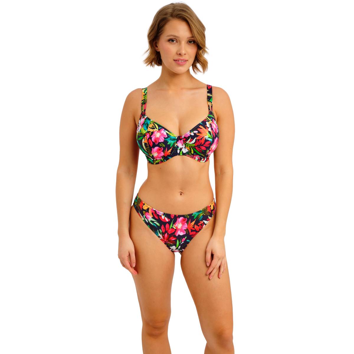 Hit the waves in style with Kailua Shores, a bold tropical print designed to make a statement. Featuring hot pinks, fiery oranges, and lush jades against a deep navy base, with select styles finished with gold-coloured leaf trims, this collection is perfect for poolside lounging or beach days. The reduced-coverage Underwire Plunge Bikini Top is ideal for tanning, with a low plunging neckline, underwired lined cups for shape and support, and fully adjustable straps with a J-hook for easy racer-back conversion, finished with decorative front loops at the apex.