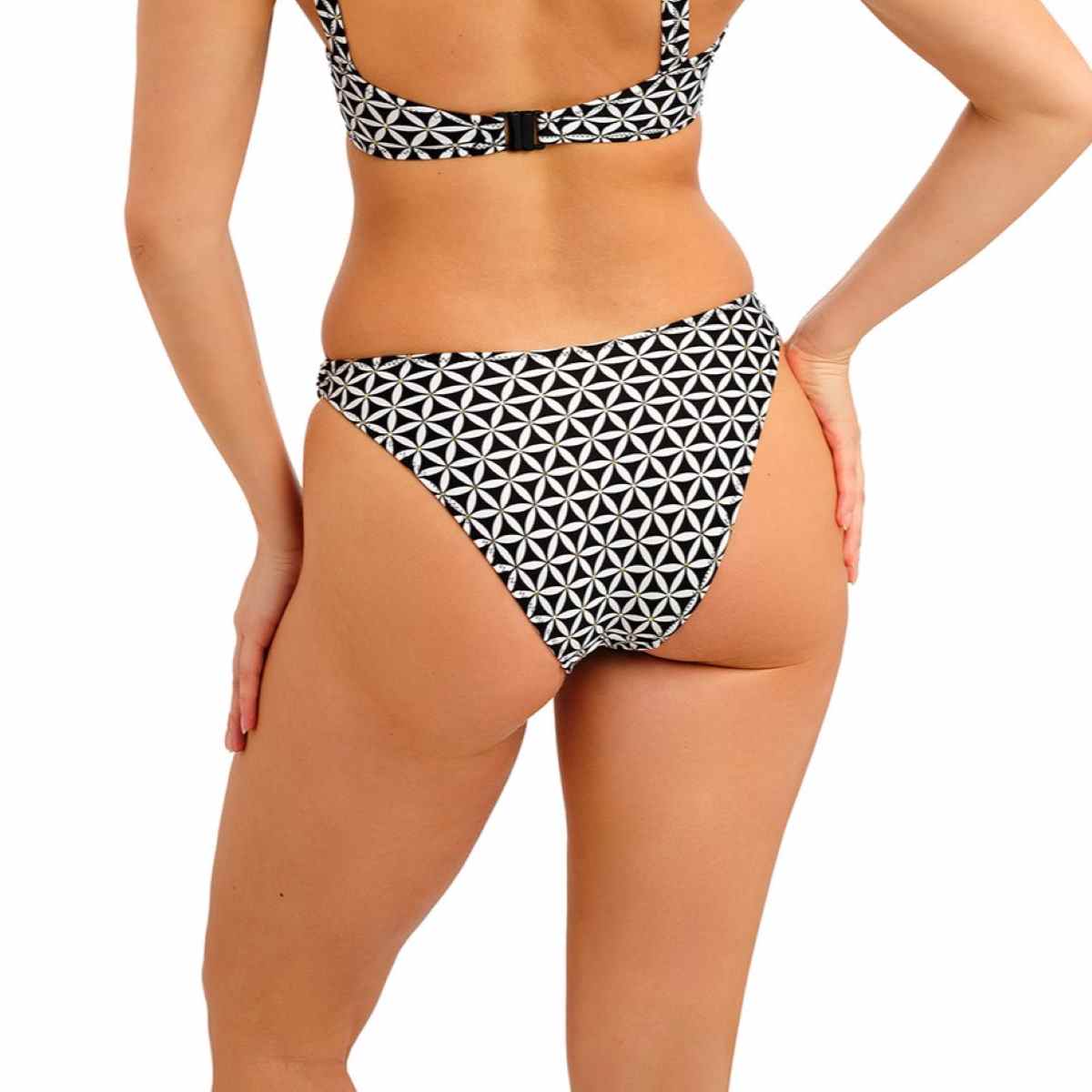 Sits high on the hips with a higher scoop leg line for a flattering, minimal-coverage fit, this piece features a skimpy bottom for a cheeky silhouette. The fabric base is adorned with decorative gold-coloured foil-style detailing, complemented by luxurious gold ring accents for a chic, modern finish.
