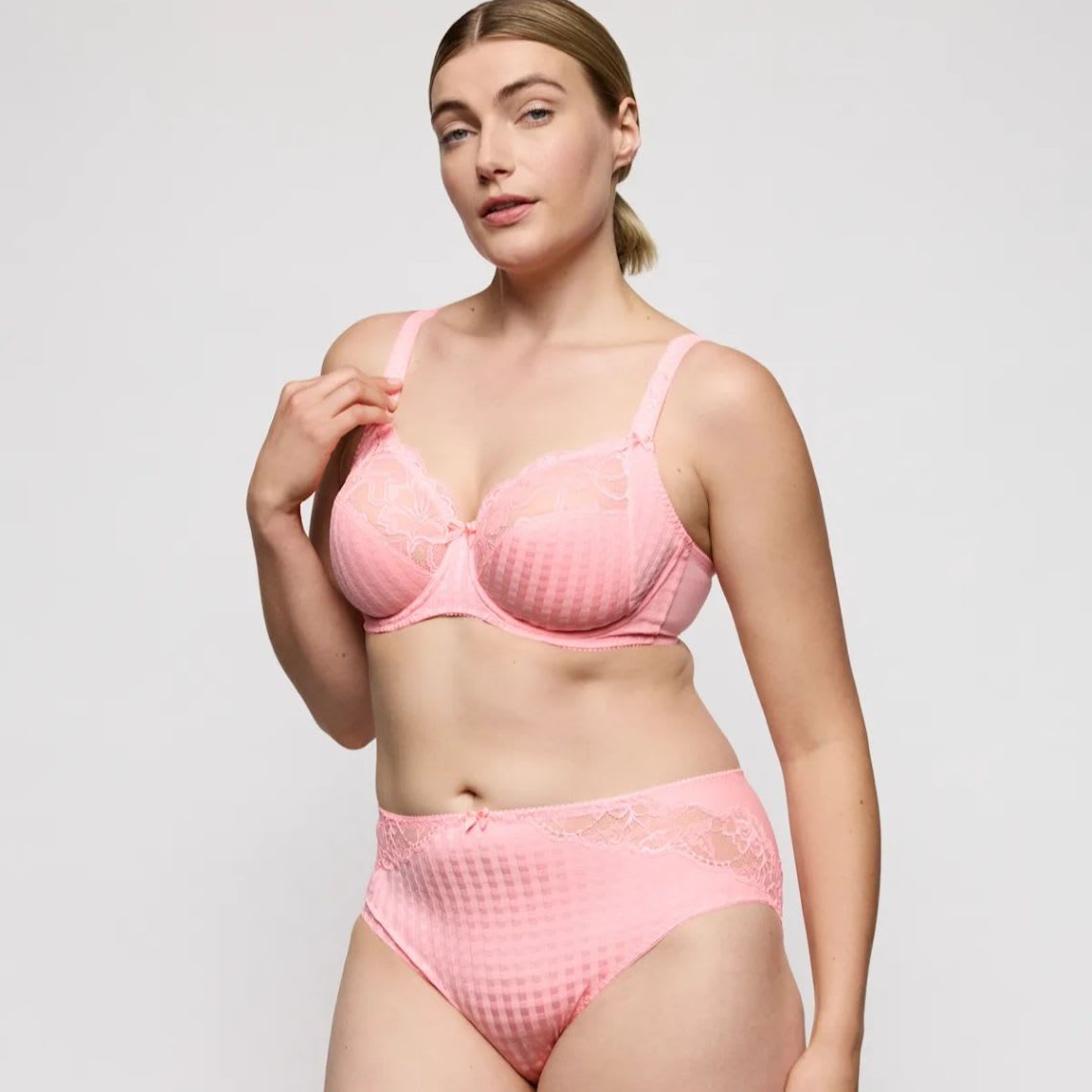 High-waisted Madison Satin Full Briefs in a checked fabric feature a luxurious semi-sheer lace trim that starts at the hips and continues downwards to frame your curves. These elegant and comfy briefs offer full rear coverage.
