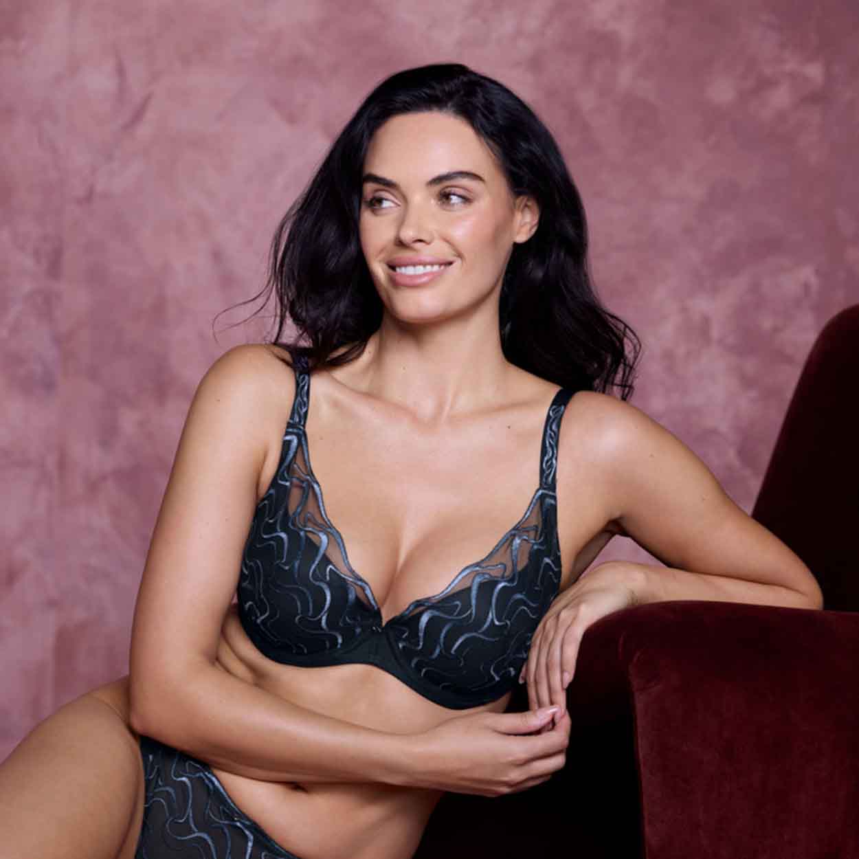 The Mayumi Plunge Bra is designed with a plunging neckline and high apex embroidery outer cups for a beautiful and bold look. The cups feature multi-tonal blue geometric embroidery with a sheen finish on a black tulle net base. Ultra-soft and light push-up pads provide cleavage, uplift, and dimension, while a V-style center front in tulle adds to the elegant design. The wings are made from powernet for support and comfort, and plain plush elastics at the underarm and underband provide a tailored finish. The front strap features embroidered detail overlaid onto the strap elastic. This bra also has fully adjustable stretch straps, a soft-touch hook and eye adjustment, and a contemporary charm detail at the center front.