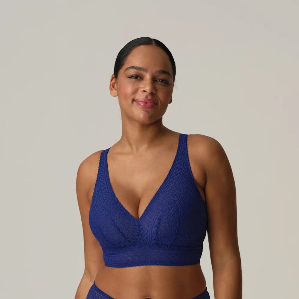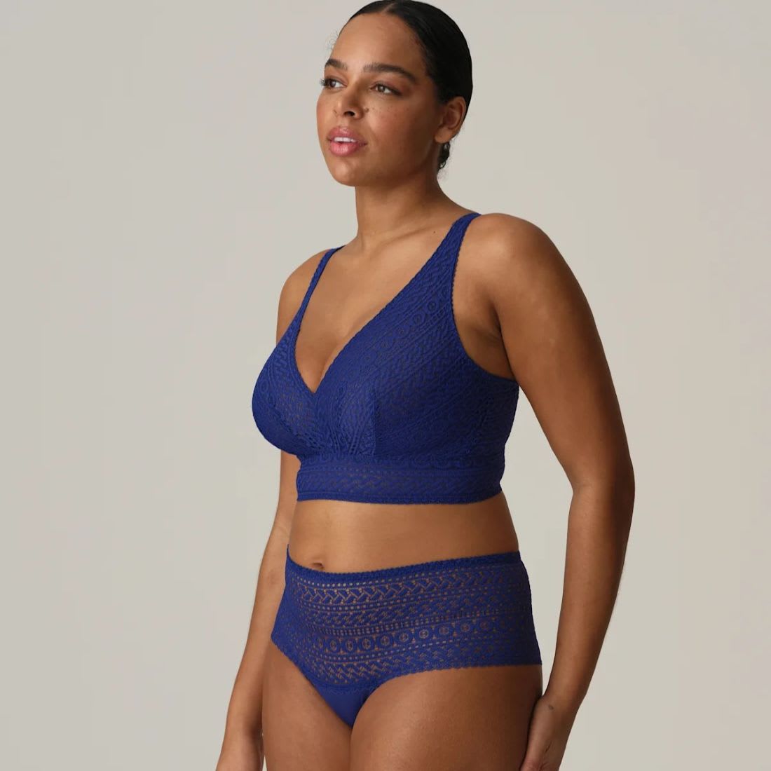 Trendy, wireless, triangle Montara Wireless Full Cup Bra in allover lace with a modern, graphic pattern design.