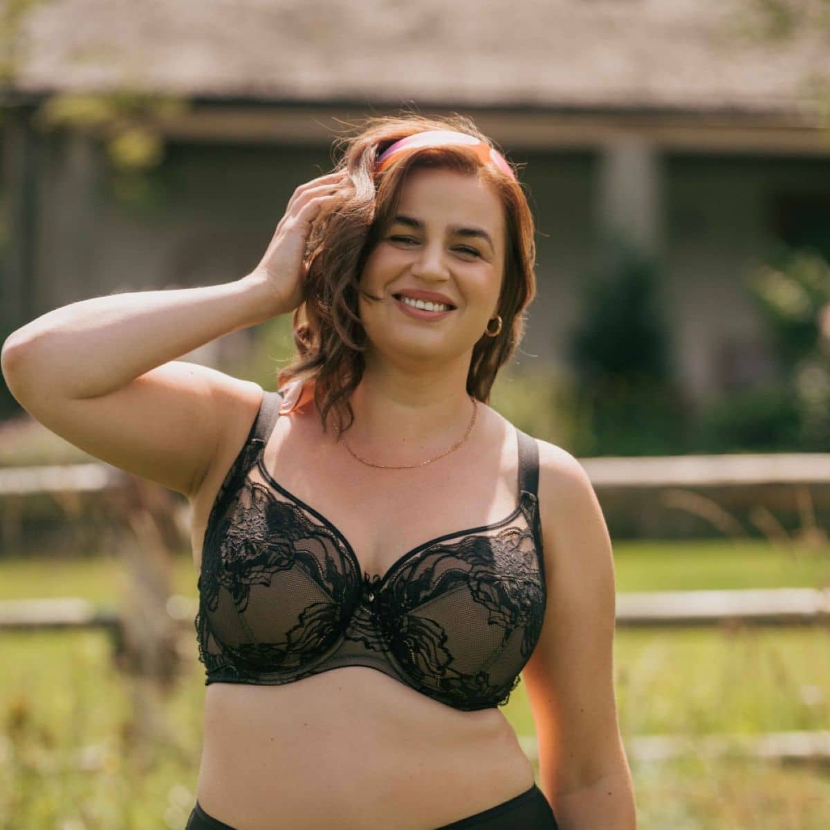 Italian lace in a sensual motif of floating waves. Tattoo effect that sensually decorates the body. The lower part of the cups is made of Italian lace and stable knitted fabric, which perfectly models larger breasts. The bra circumference is made of decorative knitted fabric and high-weight tulle. The combination of these two materials ensures not only a chic look, but above all stable support and comfort.