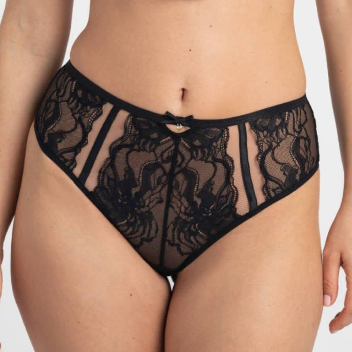 The briefs are made of Italian lace in a sensual motif of floating waves. They have detachable garter straps. A decorative cutout on the front.