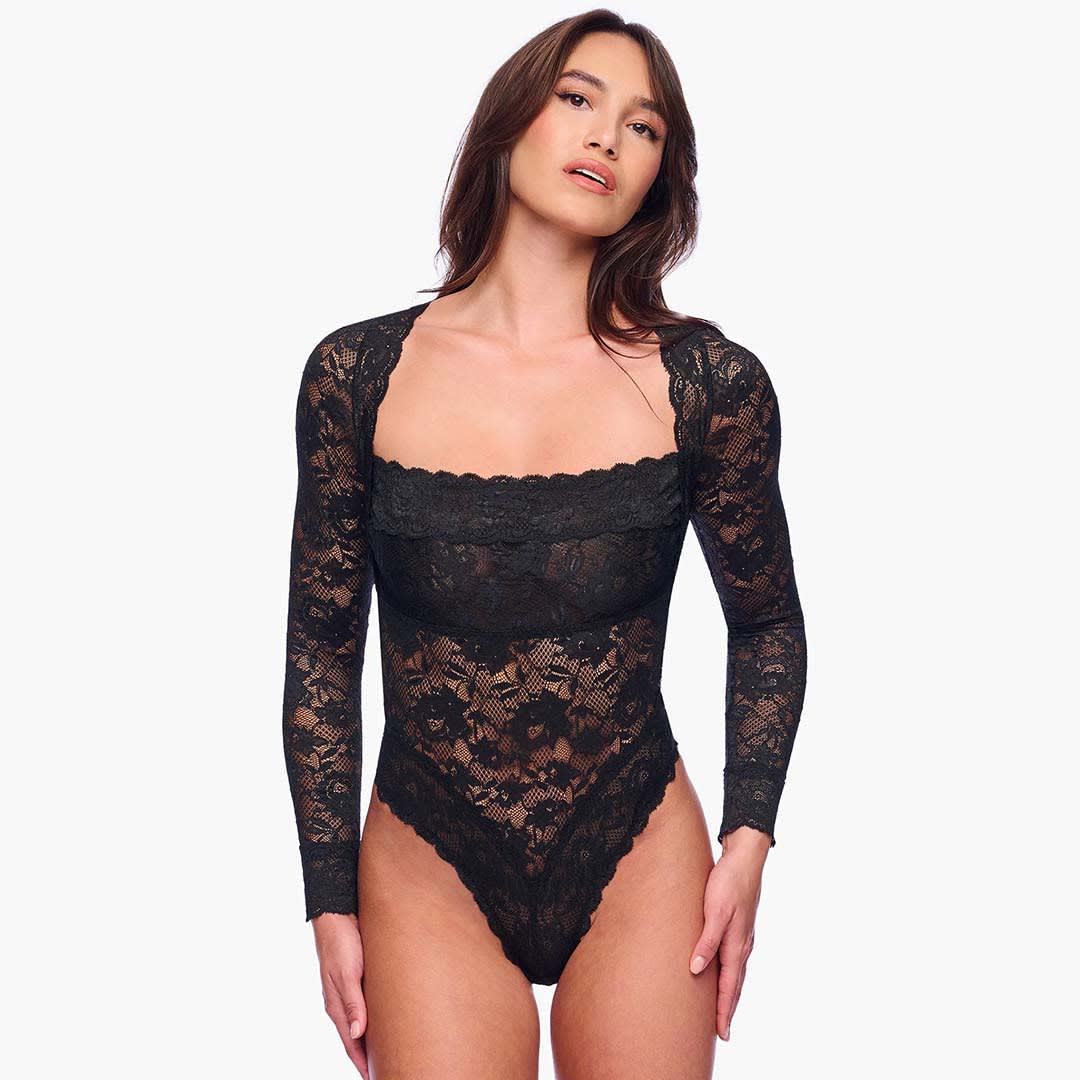 Wireless long-sleeve Never Say Never Bodysuit with mesh-lined cups and an elastic underband for support, featuring an open-back design, cotton-lined interior with snap closure.