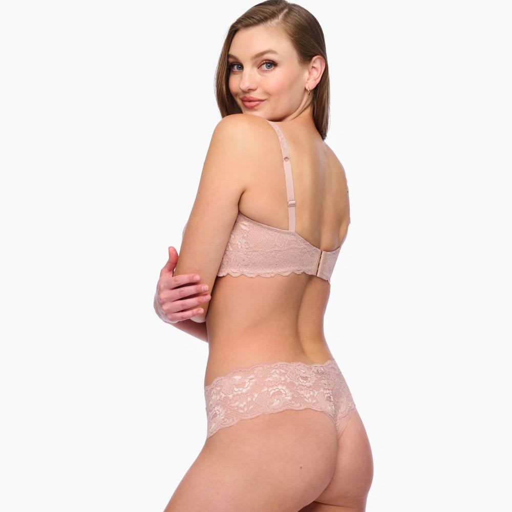 Never Say Never is loved for its beautiful floral pattern and innovative sooth, scalloped lace that lays flat and won't roll. Crafted in Italy with the highest quality materials. It has a soft, comfortable, wide waistband that won't dig which creates a perfect compromise between low rise and high rise thongs.