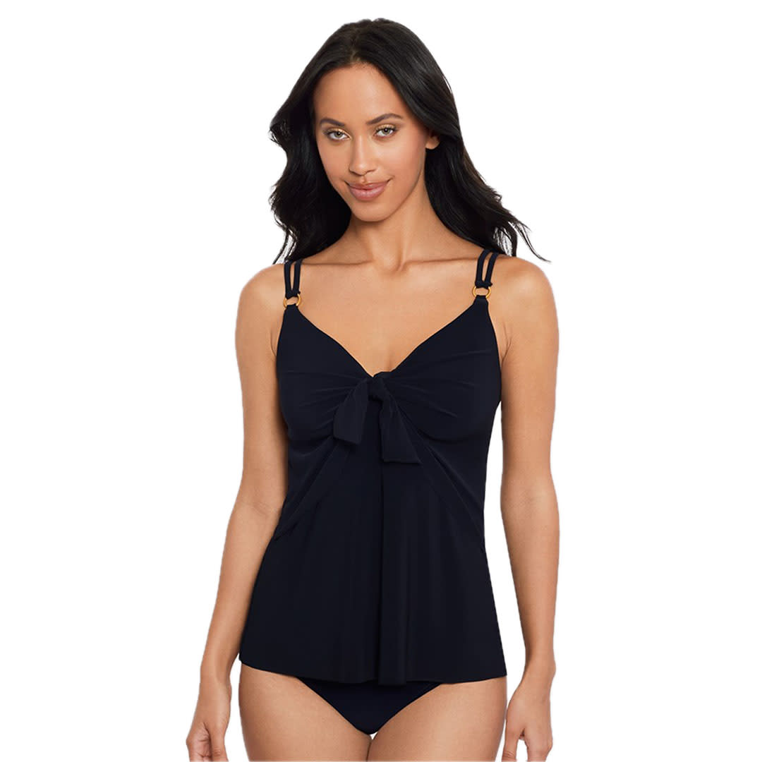 The slimming Obi One Akikio Knot Detail Loose Fit Tankini Top features a chic V-neckline with a knot and ring detail, soft removable padded cups for customisable support, and a loose, tummy-concealing fit for effortless, flattering comfort.