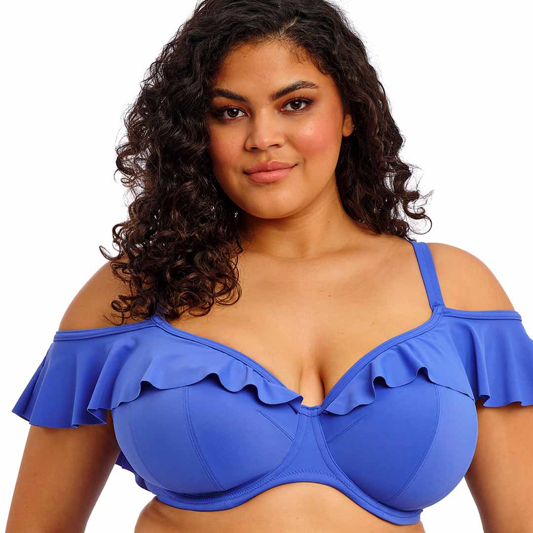 The Plain Sailing Underwire Plunge Bikini Top with narrow straps and a playful ruffle that can be worn on or off the shoulders, fully lined with light yet supportive fabric to give the look of a bikini with the fit of an Elomi lingerie bra, and cut from lightweight LYCRA® XTRA LIFE™ for lasting shape and comfort.